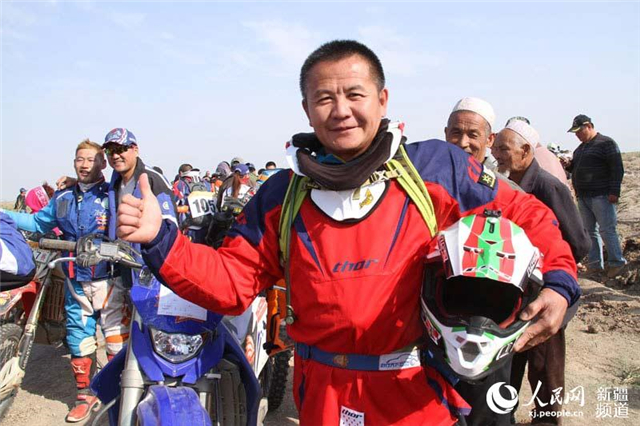 來自新疆阿勒泰的46歲的摩托車手蔣秋林連續(xù)參加了十屆環(huán)塔里木汽車摩托車?yán)?,曾獲得過兩屆冠軍。他此次是第十次參加環(huán)艾丁湖摩托車?yán)?,在前九屆摩托車?yán)惿汐@得兩次冠軍。在19舉行的拉力賽上,他的摩托車變速器在途中不幸被碎石擊壞失去成績。在被救援組救援后,他看到一名云南車手為照顧出事的隊友放棄比賽而將摩托車遺棄在路邊,盡管沒有比賽成績,他二話不說又騎上摩托車飛奔在戈壁灘上,并騎完全程。
