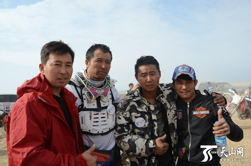 天山網(wǎng)感謝全媒體車隊(duì)三名車手和幫助任立功的法如克·乃依木合影,感謝這位好兄弟。