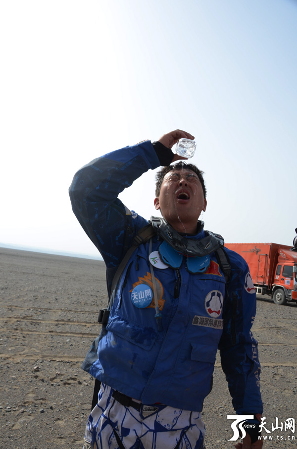 核心提示:天山網(wǎng)全媒體車(chē)隊(duì)車(chē)手肖斌賽后用水淋濕頭降溫。天山網(wǎng)鄯善訊(記者馬少賓攝影報(bào)道)10月22日,第十屆環(huán)艾丁湖摩托車(chē)?yán)惻e行第