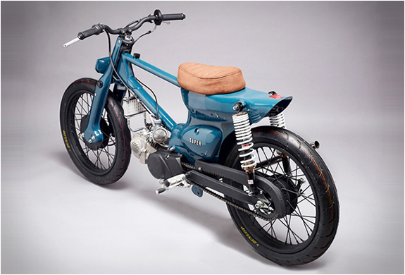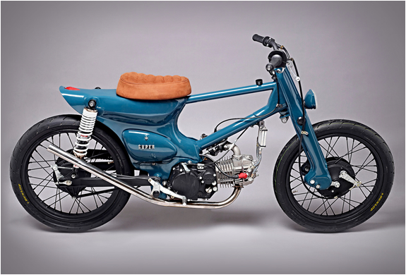 一部以 Honda 超級幼獸(Super Cub)為基礎(chǔ)改裝而成的定制車 “ 鹽罐 ”(Salt Shaker),是來自荷蘭阿姆斯特丹的超級摩托車公司(Super Motor Company)早年之作品。該作品采用了一個(gè) “ 咖啡賽車 ” 的造型,鄧立普的高性能賽車級的輪胎,完全拆除了儀表板。而原廠的 Honda 發(fā)動機(jī)被完全棄用,取而代之的是來自中國銀翔的、最大馬力輸出達(dá)到 22 匹(經(jīng)改裝之后的數(shù)字)的 150 cc 臥式發(fā)動機(jī)。