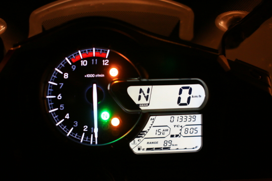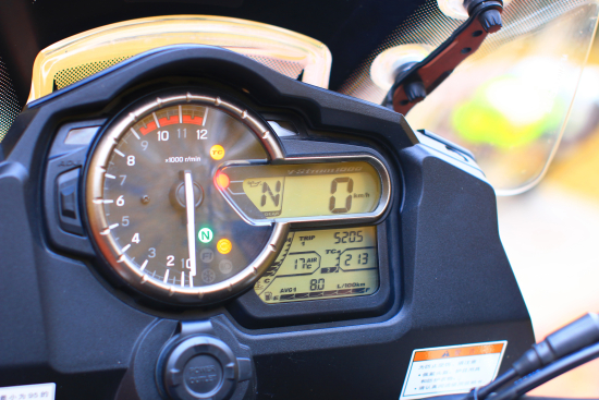 2014款V-Strom 1000的儀表板顯示信息量非常全面,超大指針式轉(zhuǎn)速表結(jié)合數(shù)顯時速表,可在不經(jīng)意間洞察速度、轉(zhuǎn)速的細微變化。TC(牽引力工作狀態(tài))、空擋、電噴自檢、低溫警示(低于3℃)、遠光、檔位、機油、防凍液、TC模式選擇、大氣溫度、時鐘、防凍液溫度(量化顯示)、綜合油耗、瞬間油耗、總里程、短里程、電壓等顯示數(shù)據(jù)一應(yīng)俱全。儀表板左側(cè)為儀表控制按鍵(Reset),儀表顯示六級儀表亮度控制擁有極佳的辨識度而且科技感十足。