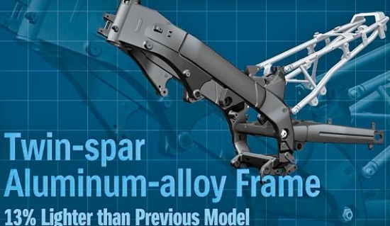 以2002款雙翼梁鋁合金跑車車架為藍本重新設(shè)計的新車架,剛性更強、重量更輕并融入了全新幾何結(jié)構(gòu)設(shè)計。相比老款,新后搖臂加長20mm, 前軸至中軸距縮短6mm,這意味著轉(zhuǎn)向更靈活度、高速更穩(wěn)定性。前、后Kayaba(KYB)全段可調(diào)減震器,43mm倒置式長行程前減震、連桿式后減震。