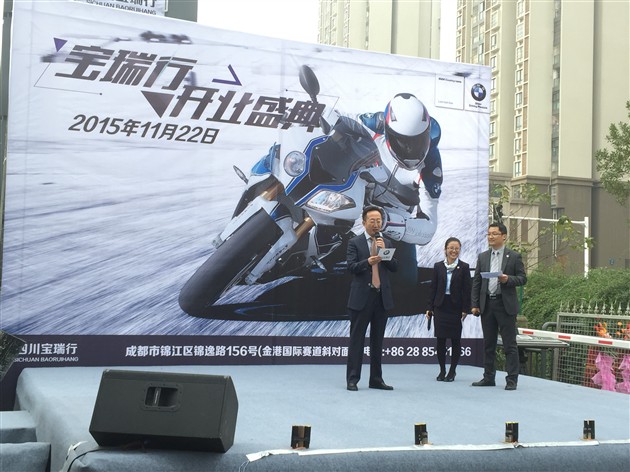 2015年11月22日,四川寶瑞行舉行了隆重的開業(yè)儀式?;顒訌脑缟?0點開始,寶馬摩托車亞太區(qū)總裁岳迪明先生,寶馬摩托車中國銷售總經(jīng)理陳蘇剛,德國駐成都總領(lǐng)事館領(lǐng)事-庹克來先生,美國駐成都總領(lǐng)事館副領(lǐng)事孔學凱蒞臨現(xiàn)場。