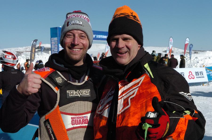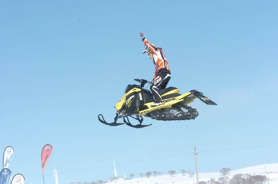 車全美冠軍克里斯·卡夫卡在展示雪地摩托車短距離飛躍動作。 當日,全國雪地摩托車越野錦標賽(承德御道口站)決賽在河北承德圍場御道口草原森林風景區(qū)舉行。來自美國的克里斯·卡夫卡和斯考特·比思是本次賽事的指導教練。卡夫卡,從13歲開始職業(yè)摩托車手生涯,多次參加X-game極限挑戰(zhàn)賽及國際雪地摩托車賽,2005年獲全美冠軍,2007年、2009年獲世界系列賽冠軍。