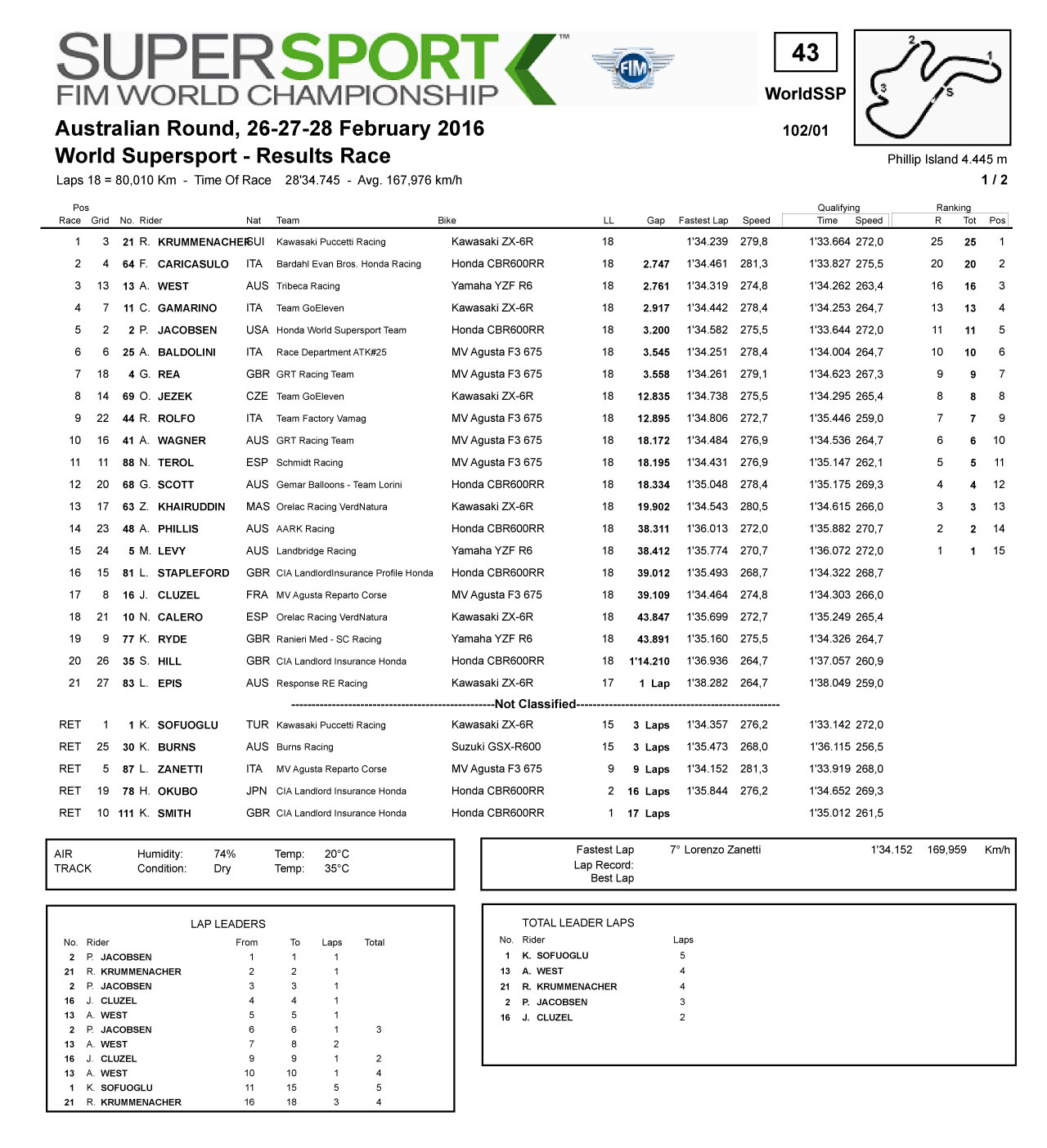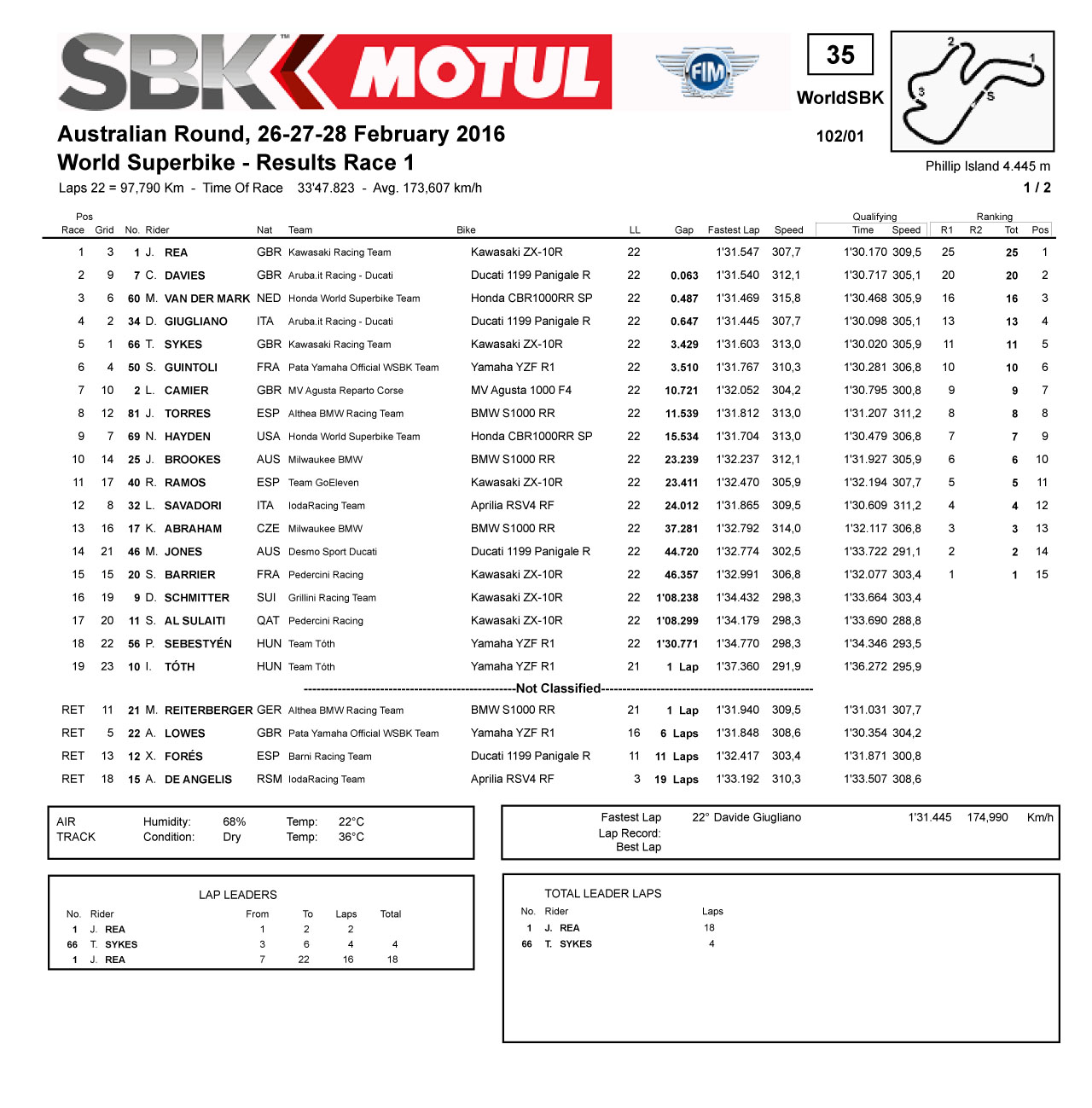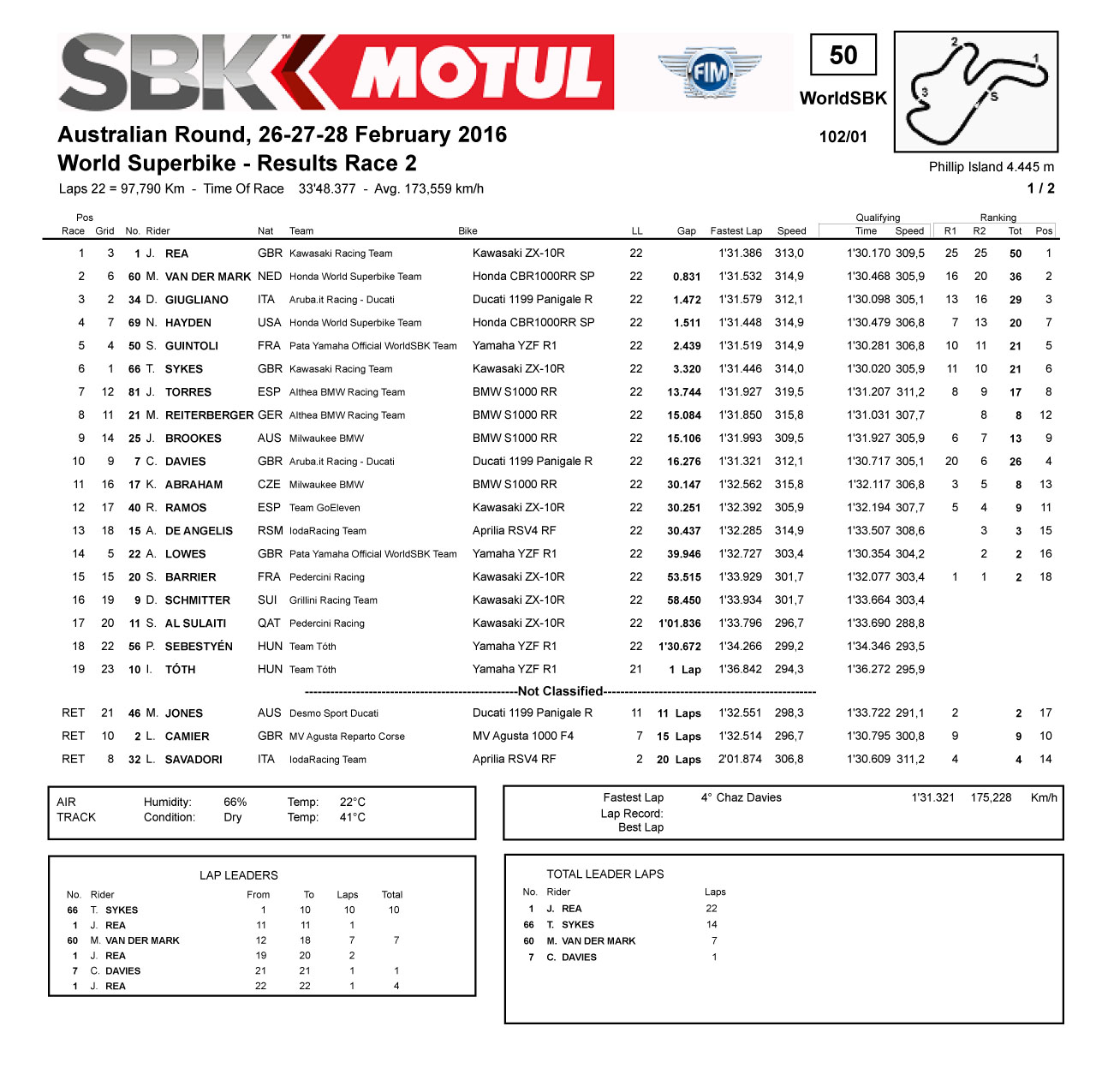2016 WSBK 澳大利亞站 — 賽事成績(jī)表
