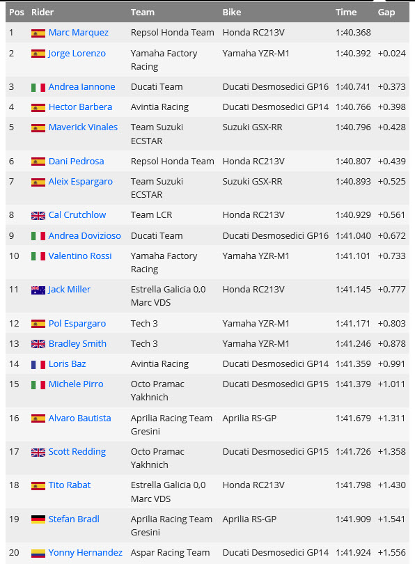 進(jìn)入前10名的還有馬奎茲的隊(duì)友佩德羅薩、本田的克拉奇羅及杜卡迪的多維齊奧索。雅馬哈的羅西有驚無(wú)險(xiǎn),勉強(qiáng)進(jìn)入第10名,與馬奎茲的成績(jī)差了0.7秒,情況并不樂(lè)觀。