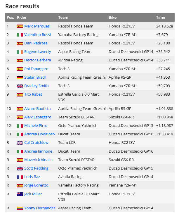 在羅西后方的是幸運的佩德羅薩,在雷丁的Pramac Ducati摩托車出問題之前本來是跟頒獎臺無緣的。Eugene Laverty直到最后一圈才超越巴柏拉和P-埃斯帕加羅成為第四名。布拉德爾為Aprilia車隊爭取到第7名,隊友巴蒂斯塔也表現(xiàn)得可圈可點,雖然在維修站道出了意外但仍以第10名結束比賽。