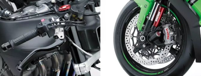 前剎系統(tǒng)標(biāo)配與Ninja H2R相同的高性能Brembo M50 鋁合金卡鉗,重量輕、剛性高。330mm直徑的雙碟剎盤令制動(dòng)力和冷卻力提升至更高境界。