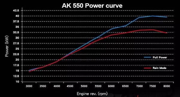 在動(dòng)力方面,AK550配備了一臺(tái)并列雙缸水冷雙凸輪軸8氣門發(fā)動(dòng)機(jī),排量為550.4mL,采用CVT無級(jí)變速,皮帶傳動(dòng),濕式多片離合器,減少動(dòng)力損失。最大功率53.5ps(39.3kW),最大扭矩55.6N·m,相比于T-MAX的34.7kW和45.1N·m來說有一定優(yōu)勢(shì)。同時(shí)為了達(dá)到優(yōu)秀的運(yùn)動(dòng)性能,整車重心設(shè)計(jì)得較低,座高只有785mm,前后重量為50:50,有更佳的彎道表現(xiàn)。