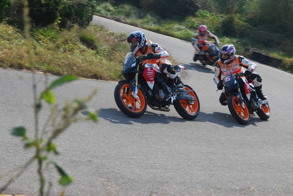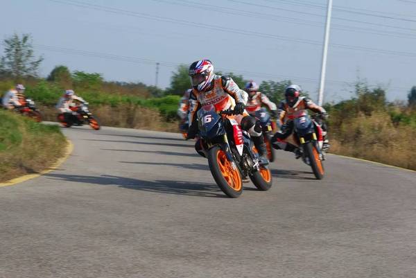 午飯后,經(jīng)過(guò)簡(jiǎn)短的休息,入選決賽的9名車手早早來(lái)到賽車前。隨著五羊-本田營(yíng)銷服務(wù)部部長(zhǎng)助理潘遠(yuǎn)華先生手中的綠旗落下,9輛“暴眼”如脫韁的野馬沖出發(fā)車區(qū),高性能單缸的高頻嘯叫匯成一首奔騰的交響樂(lè)響徹賽道,聽(tīng)得人血脈賁張!