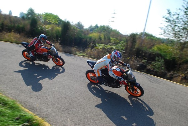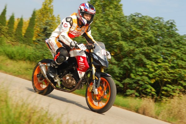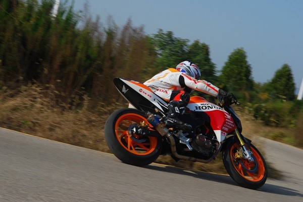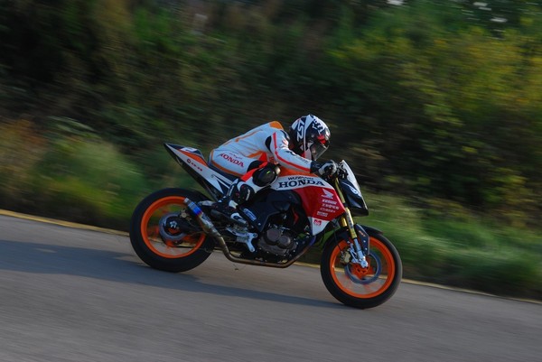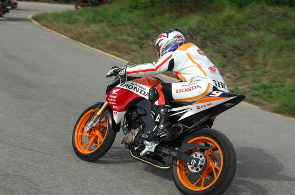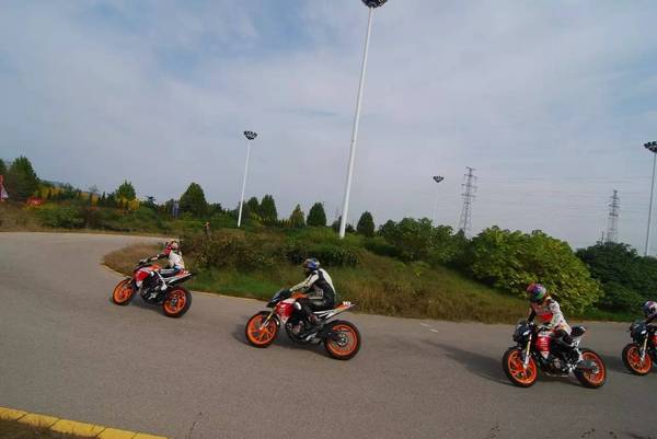 在充分熟悉賽道之后,實(shí)車練習(xí)開(kāi)始了——教練駕車在前、學(xué)員緊隨其后,針對(duì)賽道改裝的嶄新的暴鋒眼CB190R馱著身著嶄新護(hù)具的車手們,在賽場(chǎng)上一圈圈奔跑并在教練的引導(dǎo)下越跑越快……