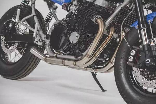 CB750的四缸發(fā)動機會讓你的作品很飽滿,這是一個天然的優(yōu)勢,所以很多改裝作品會著重突出這臺發(fā)動機的表現力,而這輛YKB-CB750卻并沒有這么做,而是利用線條和顏色為這輛車添彩。首先車架經過了重新設計,冷灰色的顏色增加了整車色彩的層次。輪轂改小,輪胎加厚,通過輪胎的視覺效果平衡發(fā)動機的體量感,看上去不會顯得發(fā)動機過于臃腫。