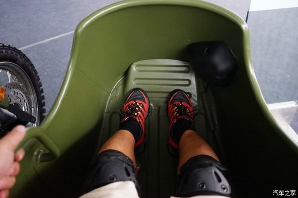 上圖是筆者左手抓住貨斗扶手,雙腳踩在貨斗底部的防滑凸起上的特寫。以筆者身高不足1.73m來比對,JH600BJ的貨斗空間還是很有優(yōu)勢。在必要時候可以應(yīng)急搭載第4名乘員或承載更多的輜重。