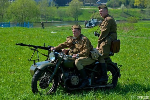 甚至在二戰(zhàn)爆發(fā)前,斯大林看中了德軍裝備的寶馬R71摩托,并力圖通過正規(guī)渠道引進(jìn)并國產(chǎn)化(此前已經(jīng)有引進(jìn)德軍1、2號坦克技術(shù)改造T系列坦克的先例)。但是隨之而來的閃擊波蘭并開啟第二次世界大戰(zhàn),蘇軍偷運(yùn)了5臺R72系列摩托,交由烏拉爾廠逆向仿制。最終烏拉爾版“伊萬斯基機(jī)”M-72邊三輪摩托進(jìn)入蘇軍服役。如上圖所示,在二戰(zhàn)重演真人秀中,蘇軍步兵駕駛,M-72三輪摩托、架著MG32機(jī)槍并搭乘偵察兵的形象極為真實(shí)。