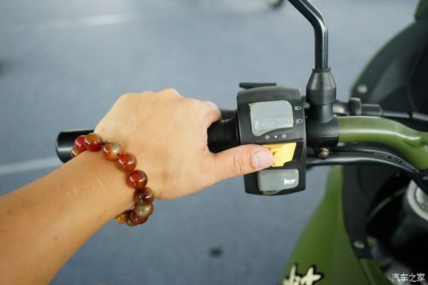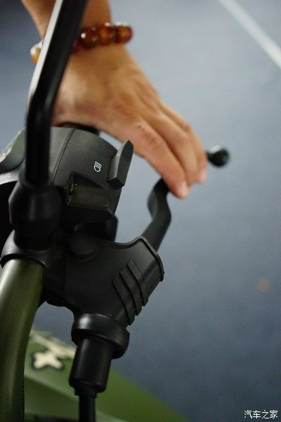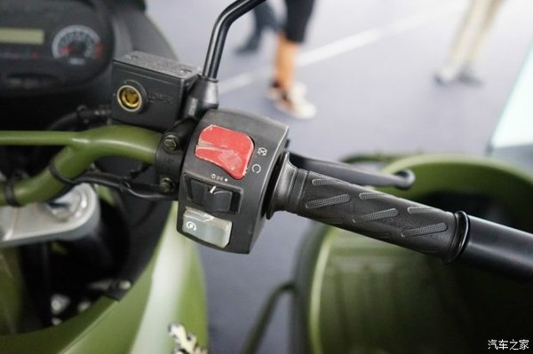 上圖是JH600BJ轉(zhuǎn)向車架右側(cè)握把以及各開關(guān)特寫。從上依次向下布置的開關(guān)為:紅色電源啟動開關(guān)(ACC)、黑色遠(yuǎn)近光開關(guān)、灰色車輛啟動開關(guān)。旋轉(zhuǎn)右側(cè)握把即可加油(替代了汽車的油門踏板)。