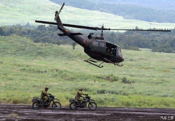 上圖是日本陸軍在富士演習(xí)中,與UN-1系列直升機(jī)隨行“空地一體”式戰(zhàn)術(shù)偵查。