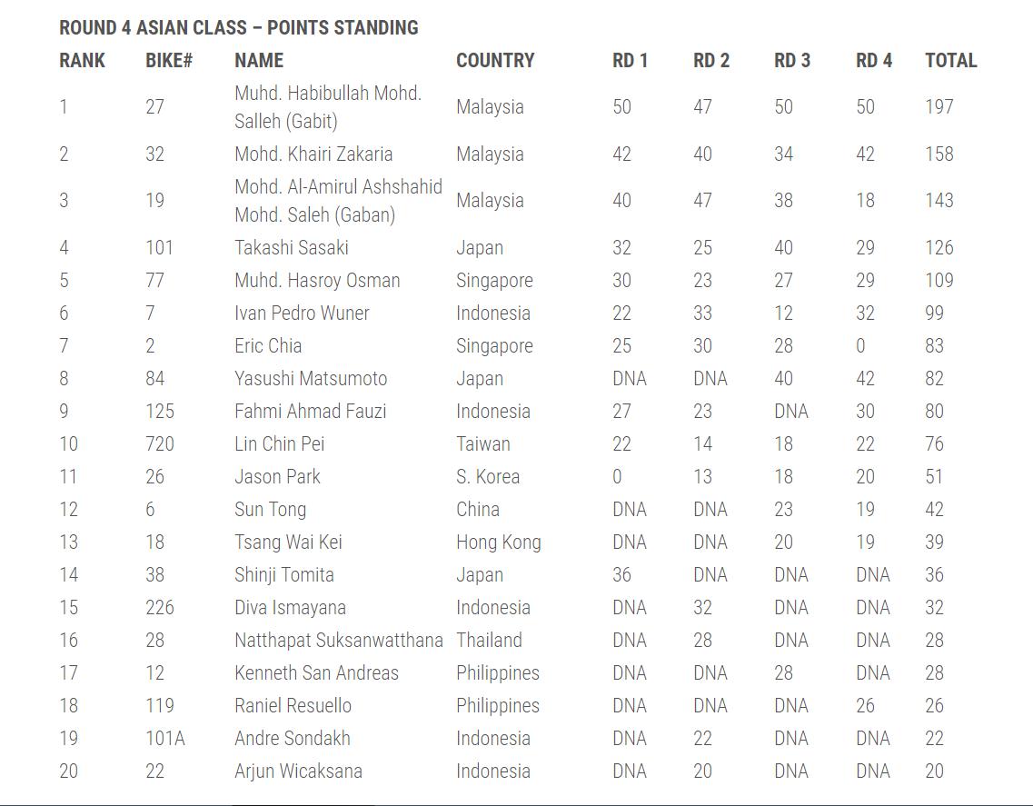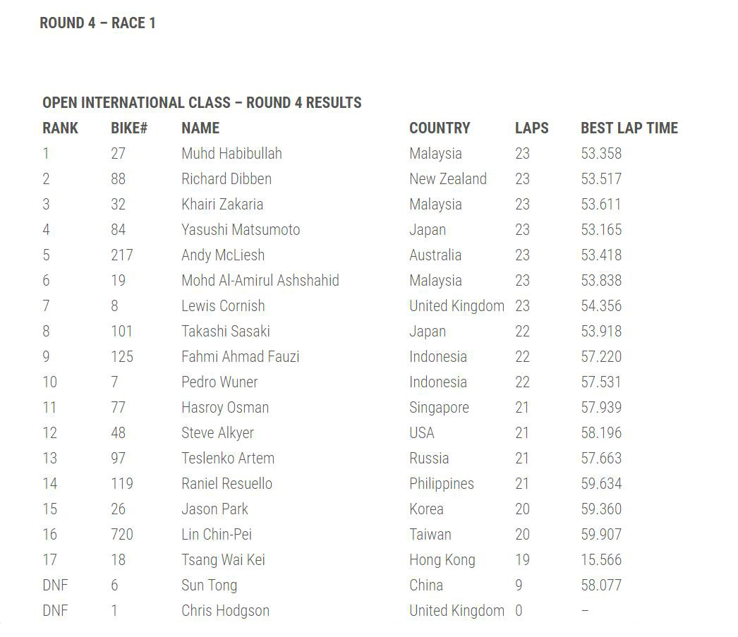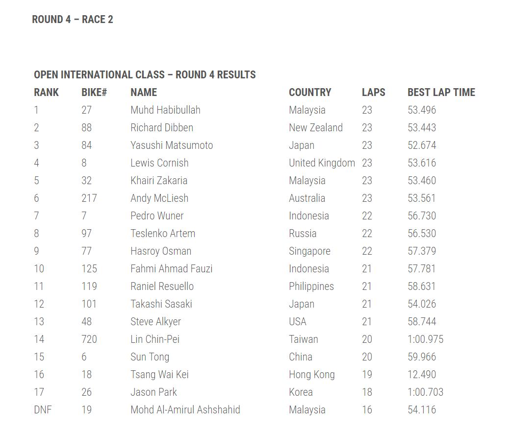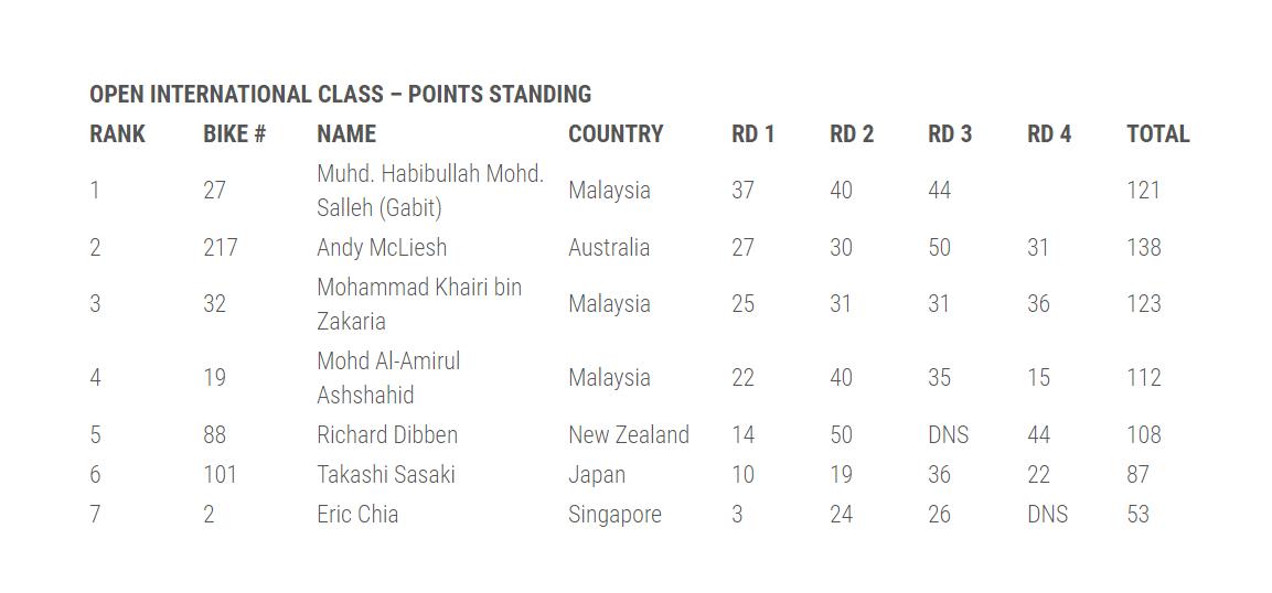 占據(jù)主場(chǎng)之利的馬來(lái)西亞車(chē)手 Muhd Habibullah 順利奪得了國(guó)際公開(kāi)組兩節(jié)比賽的冠軍,他同時(shí)也奪得了國(guó)際公開(kāi)組和亞洲組的年度總冠軍。新西蘭車(chē)手 Richard Dibben、馬來(lái)西亞車(chē)手 Khairi Zakaria 分別奪得了國(guó)際公開(kāi)組第一節(jié)比賽的二、三名,而第二節(jié)比賽的亞軍是 Richard Dibben、季軍則是日本車(chē)手 Yasushi Matsumoto。
