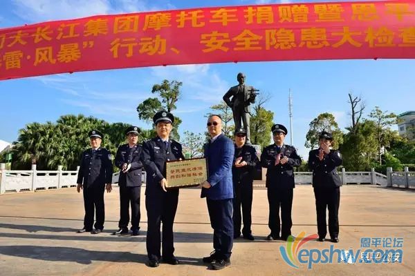 在捐贈暨誓師儀式上,江門市大長江集團(tuán)董事鄧衛(wèi)民先生向市公安局交付了代表捐贈60輛摩托車的“車匙”牌,我市副市長、公安局長朱立輝向大長江集團(tuán)公司回贈了紀(jì)念牌匾。