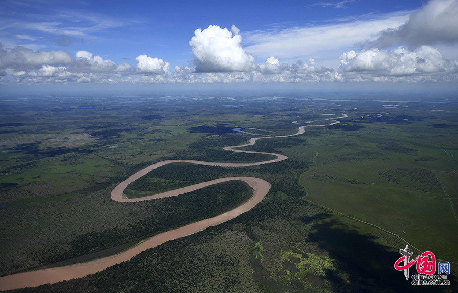 2017年01月02日,2017達(dá)喀爾拉力賽第一階段首日,比賽在巴拉圭的亞松森與阿根廷城市雷西斯滕西亞之間進(jìn)行??罩信臄z的蜿蜒的貝爾梅霍河,在阿根廷福莫薩省的一個(gè)小鎮(zhèn)附近拍攝。