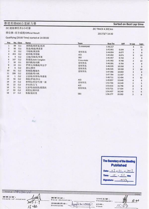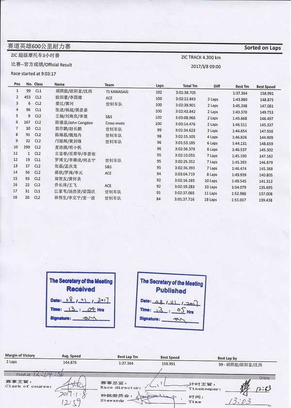 2017 ZIC超級(jí)摩托車3小時(shí)賽-官方成績(jī)