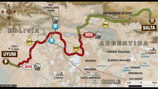 本賽段從玻利維亞烏尤尼出發(fā),終點(diǎn)設(shè)在阿根廷的薩爾塔,賽段全長892公里,原本特殊賽段492公里,但是比賽再次受到大雨襲擊,導(dǎo)致河床水位升高,所以組委會再次更改了SS8賽段比賽線路,將特殊賽段縮短為417公里。