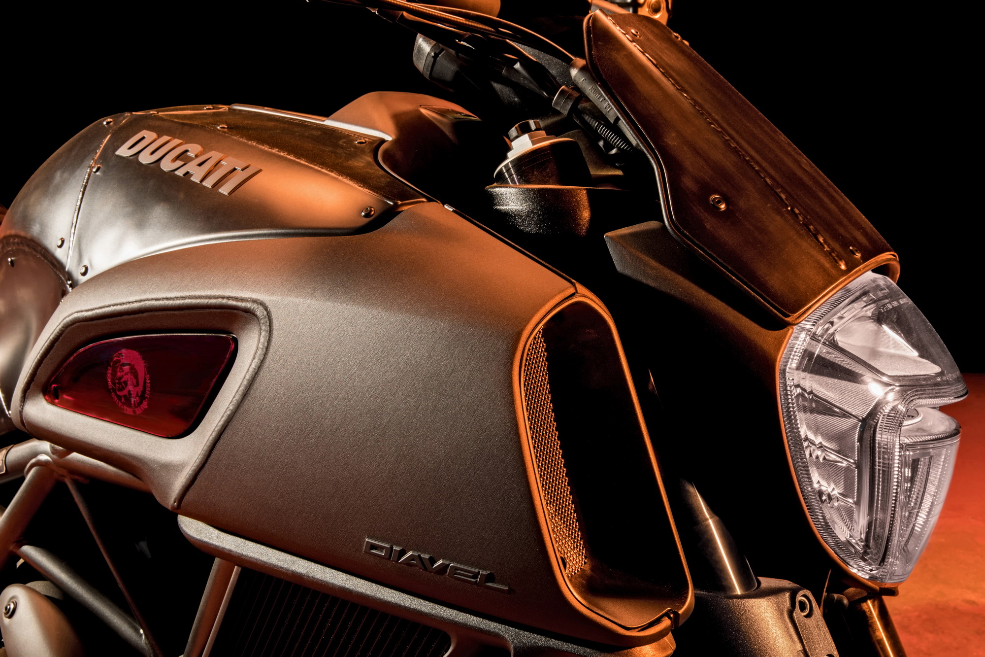 Diesel 創(chuàng)立于 1978 年,是意大利當(dāng)?shù)氐囊粋€牛仔褲、高級休閑服飾和衣物配件的品牌,將個性和自我表達(dá)奉為他們多年來的理念。杜卡迪的 Diavel “ 魔鬼 ” 則是一部重型摩托車,搭載一副最大馬力輸出達(dá)到 162 匹的水冷四沖程 L 型兩汽缸的 Testastretta 11° DS 發(fā)動機(jī)。這部 Diavel “ 魔鬼 ” Diesel 的車身到處將焊接和鉚釘直接裸露出來,有 一個經(jīng)過獨(dú)特設(shè)計、采用高級皮革制作的鞍座,紅色的前剎車卡鉗,黑色陶瓷涂層的排汽管等。