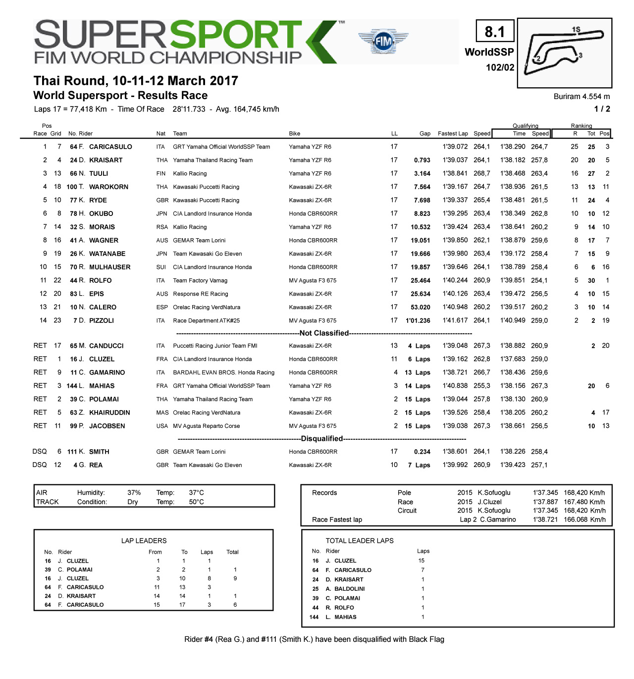 Yamaha 在這一站 WSS 600(WorldSSP 600)級別的比賽可謂光芒四射,最終駕駛 64 號賽車的 Yamaha GRT 工廠車隊(duì)車手 F. CARICASULO 奪得了冠軍,持外卡參賽、駕駛 4 號賽車的泰國 Yamaha 工廠車隊(duì)的本地車手 D. KRAISART 獲得了第二,另一支 Yamaha 車隊(duì)的車手、駕駛 66 號賽車的 N. TUULI 奪得了第三。