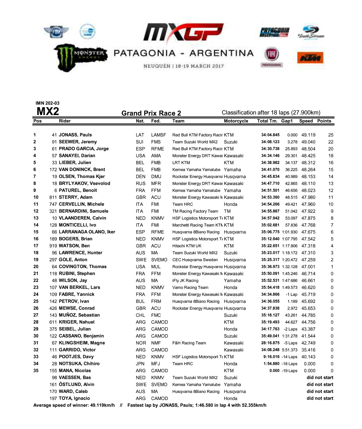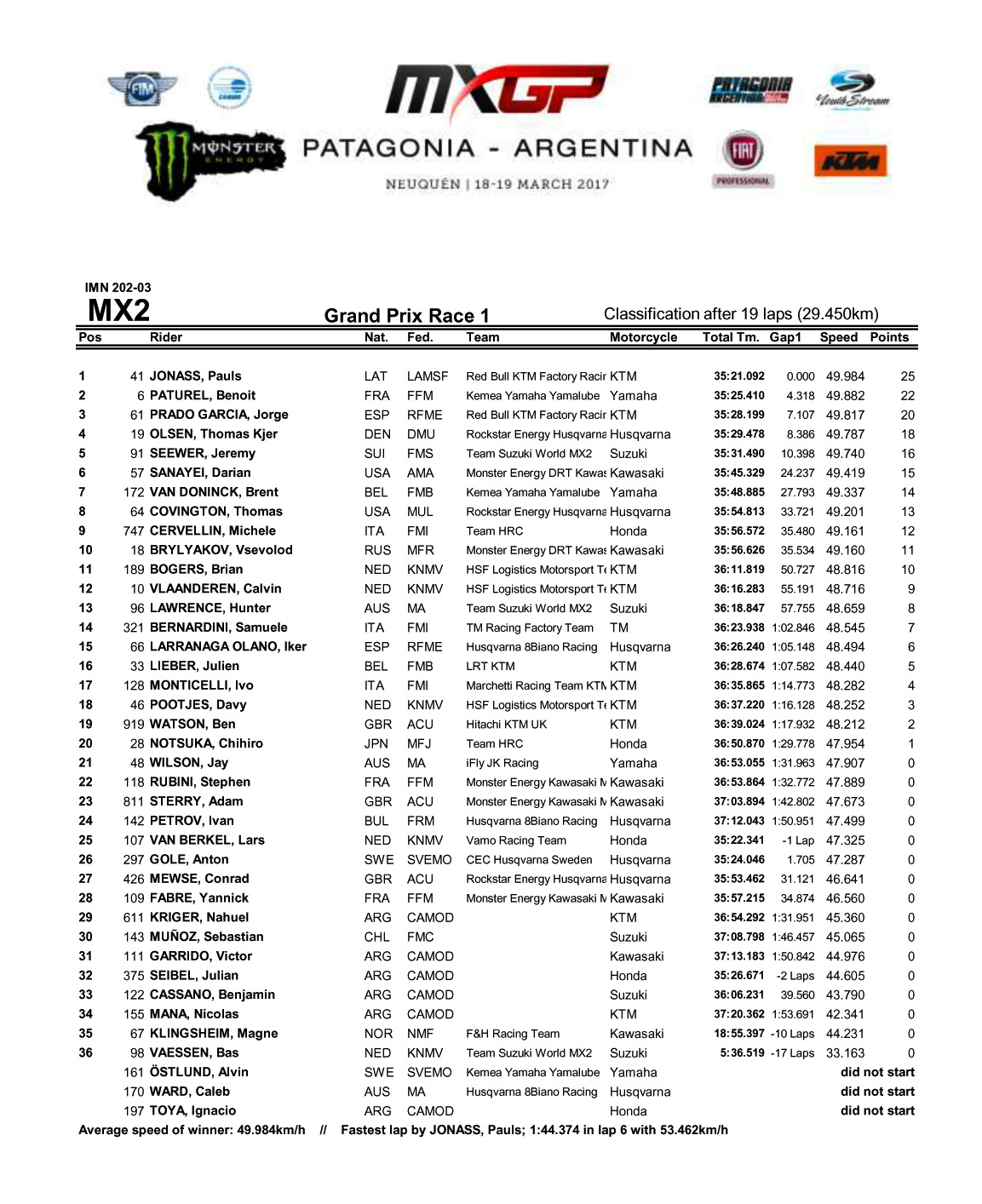 MX2 級別,KTM 車隊的拉脫維亞車手 P. Jonass 順利連奪本站兩節(jié)比賽的第一。這是繼第一站卡塔爾之后,Jonass 在新賽季所取得的第二次全勝。積分榜上,瑞士車手 J. Seewer(Suzuki)以 110 分暫時排在榜首,本站獲得了全勝的 P. Jonass 以 107 分排在了第二,法國車手 B. Paturel(Yamaha)以 104 分排在了第三。