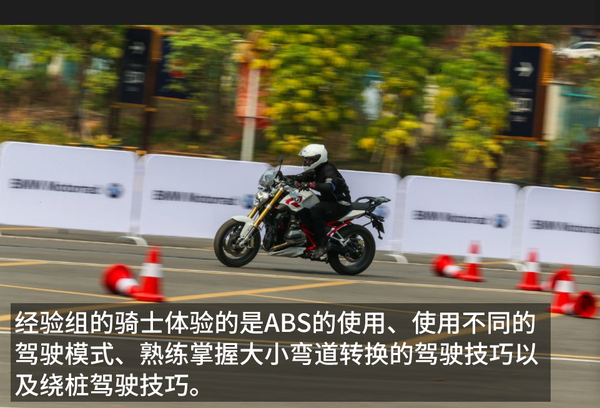 經(jīng)驗組的騎士體驗的是ABS的實際作用、使用不同的駕駛模式、熟練掌握大小彎道轉(zhuǎn)換的駕駛技巧以及繞樁駕駛技巧。頗有些寶馬精英訓(xùn)練營的味道。