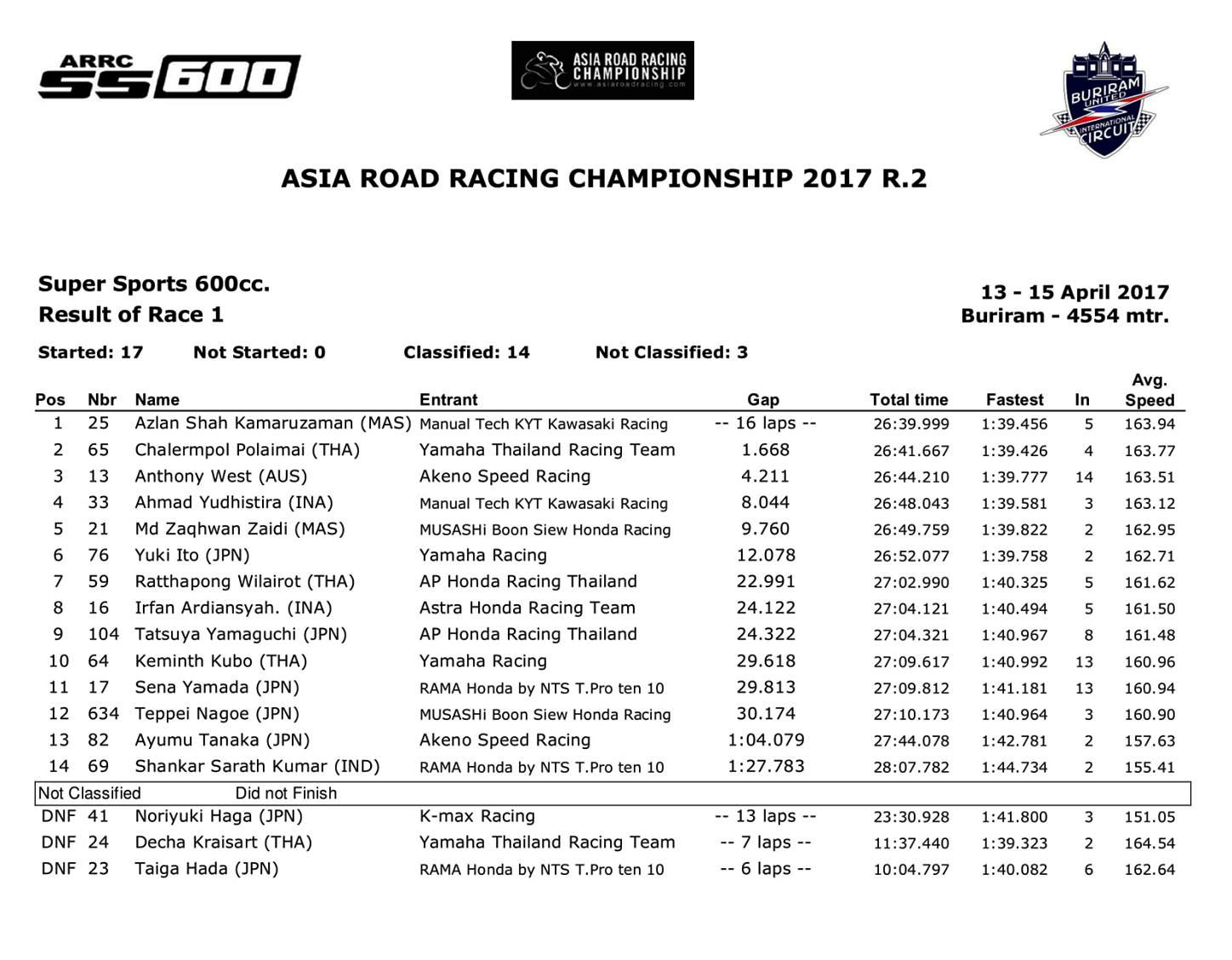 2017 ARRC 泰國站,AP250、SS600 第一節(jié)賽事成績