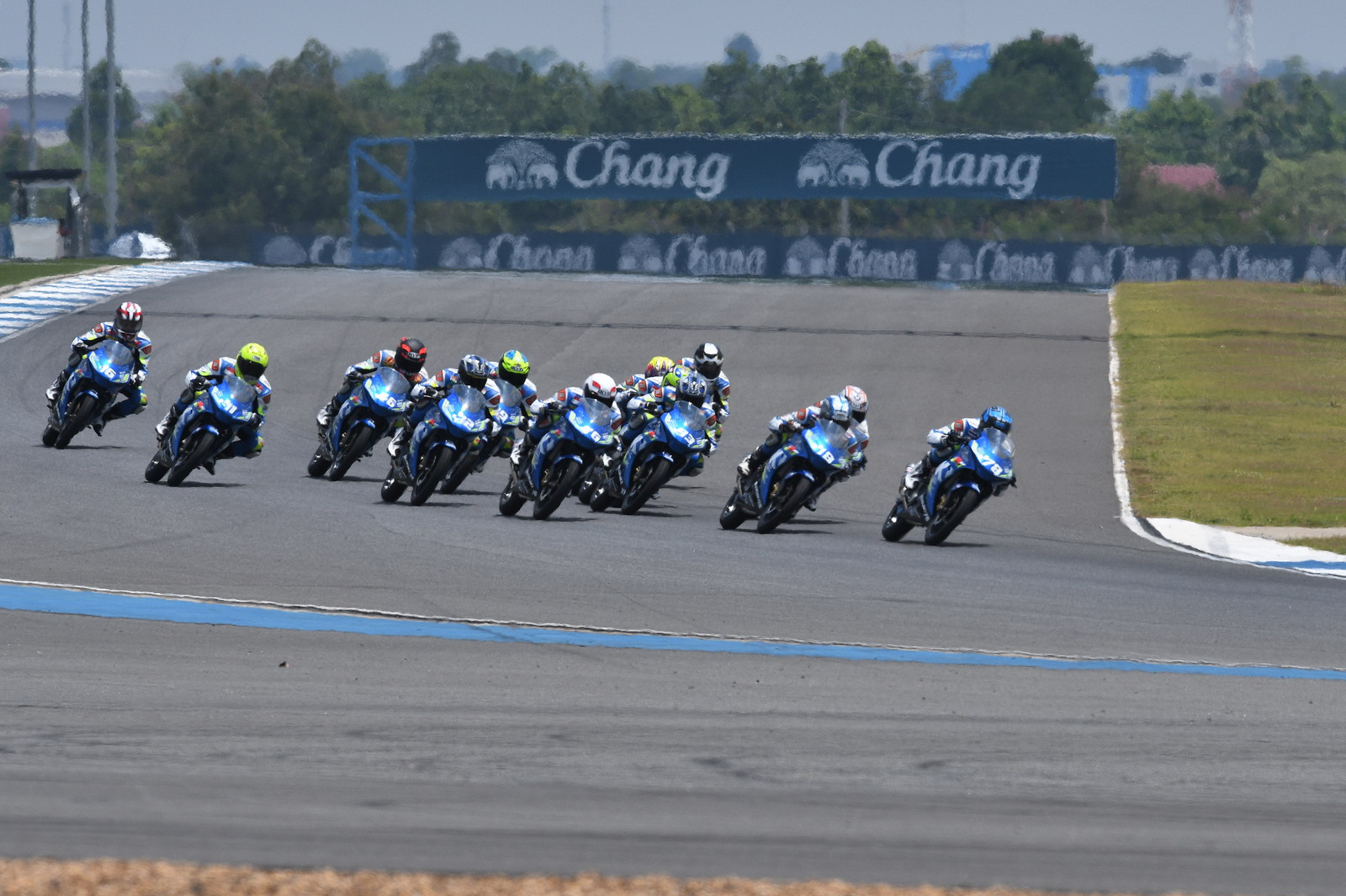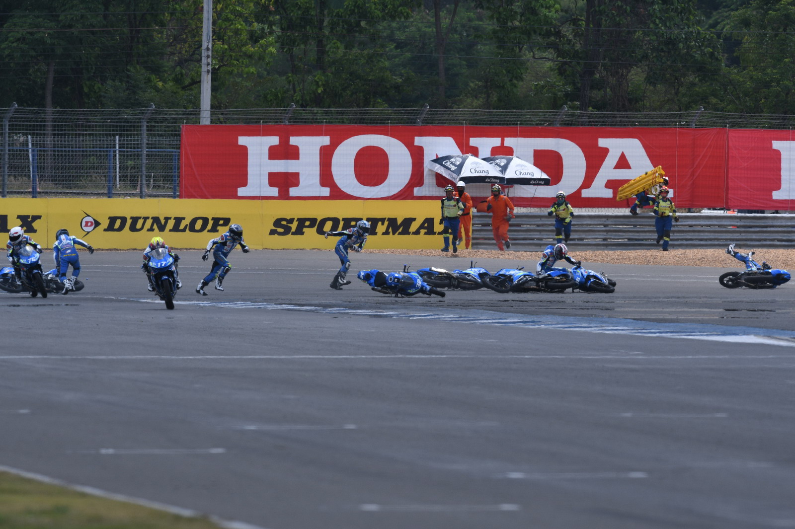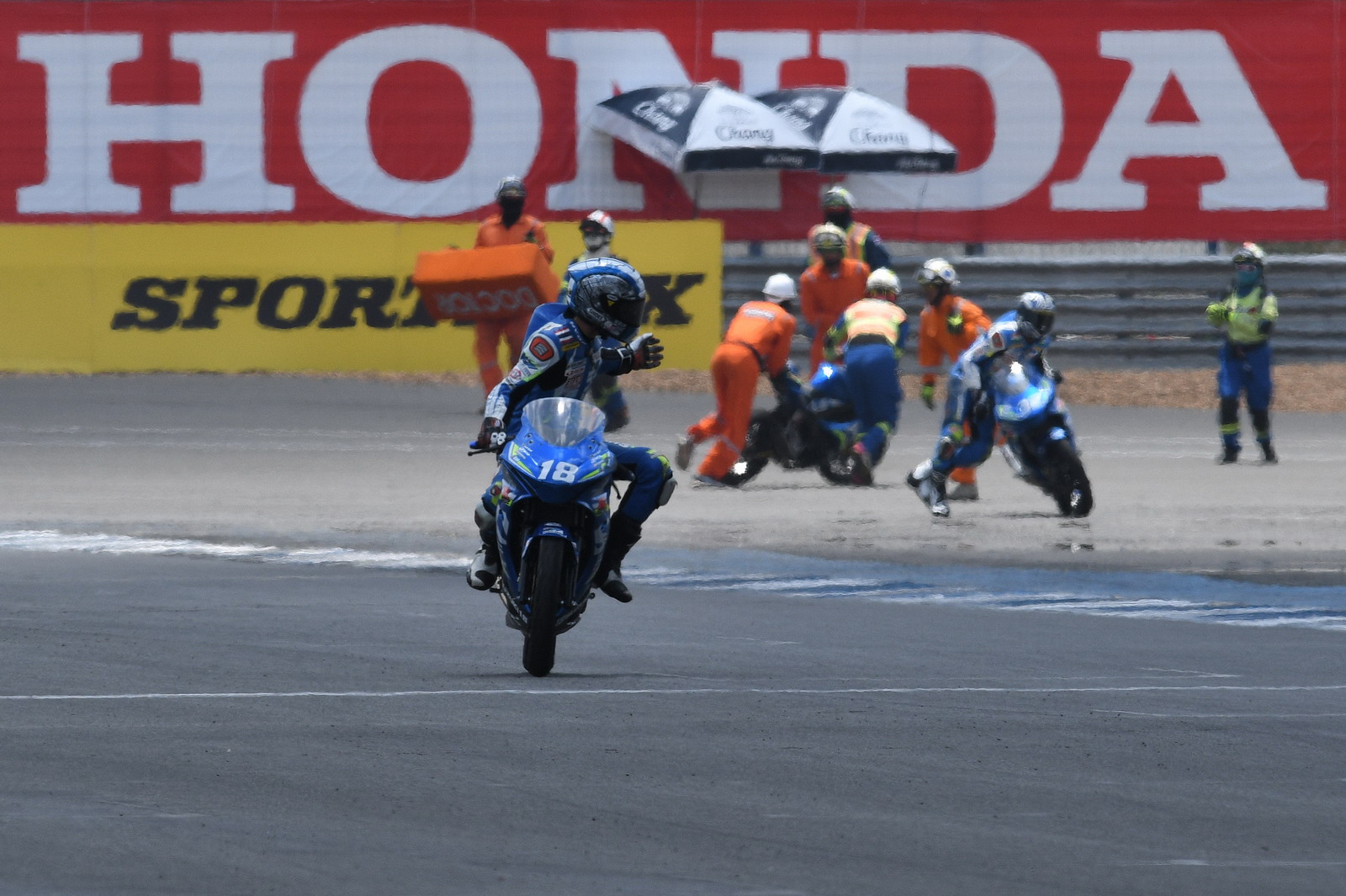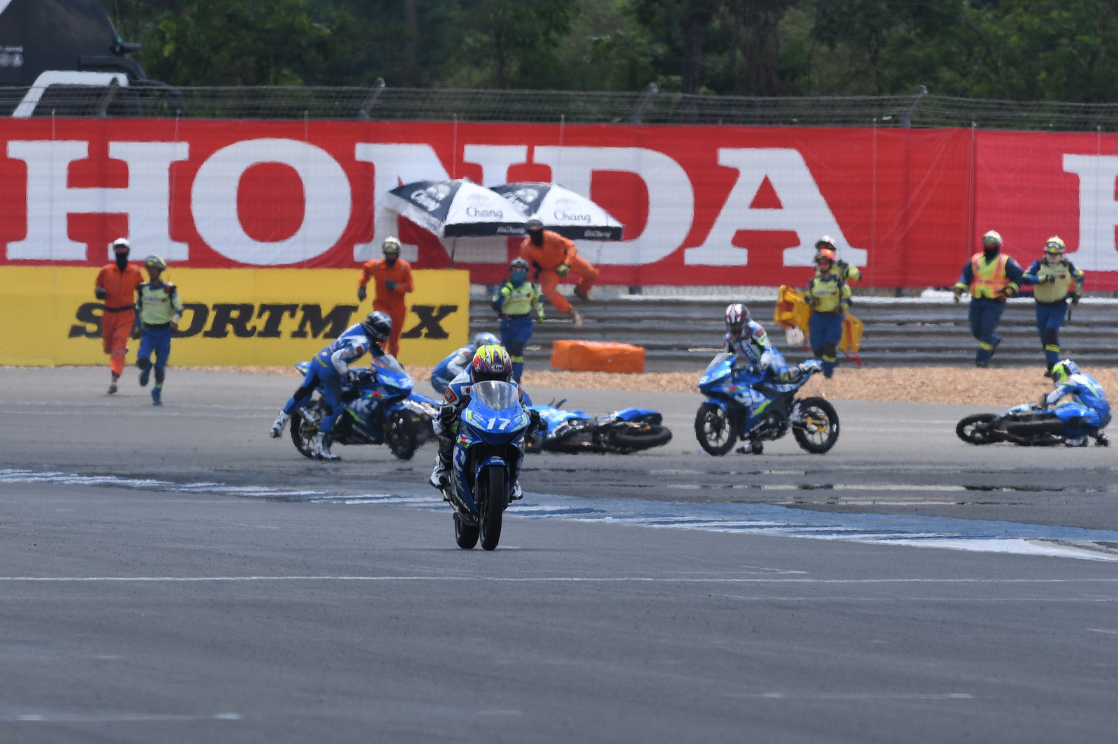 2017' ARRC 第二站泰國,上周六(四月 15 號)舉行的 SAC(Suzuki Asia Challenge,Suzuki 亞洲挑戰(zhàn)賽,統(tǒng)一使用印尼 Suzuki 最新推出的小型跑車 GSX-R 150 作為賽車)第二節(jié)的比賽,最后一圈比賽的最后一個(gè)彎道,因其中兩臺(tái)賽車鎖死后輪首先滑倒,波及了多臺(tái)在前面第一集團(tuán)的賽車,相對較后的賽車未受波及、揀了個(gè)便宜而獲勝。這樣的場景,可見 ARRC 里這些年輕車手的拼勁。