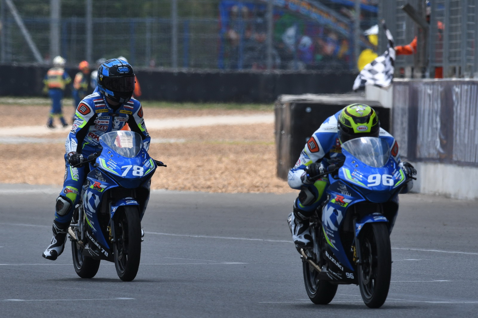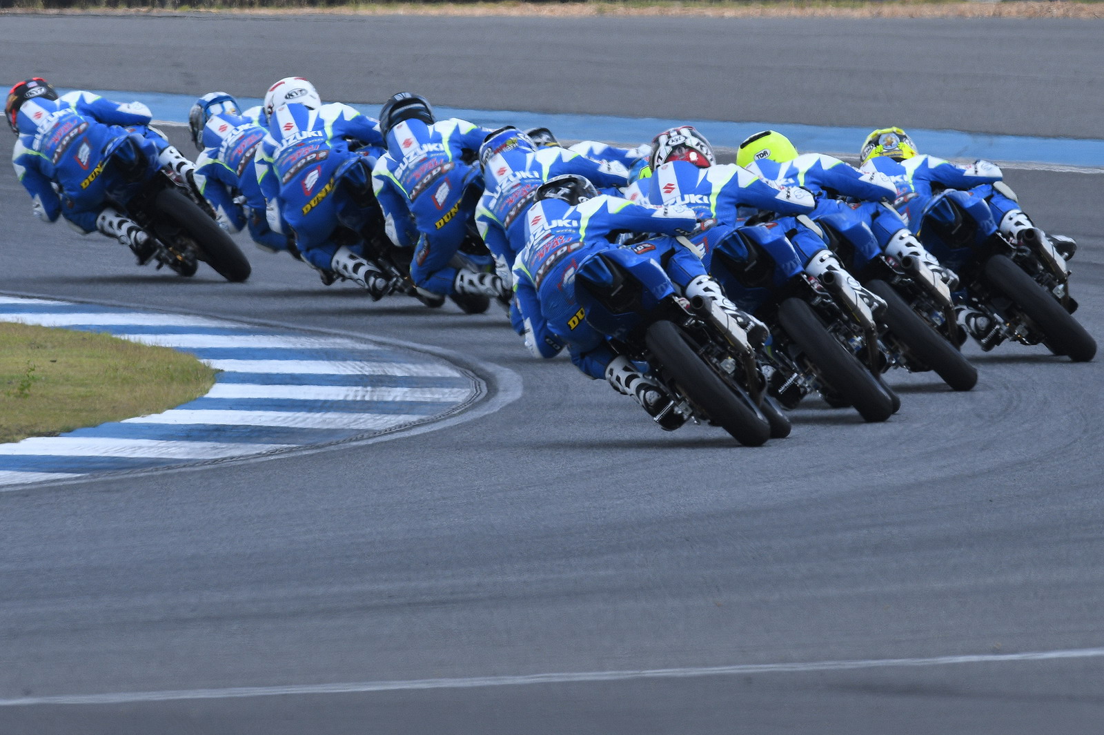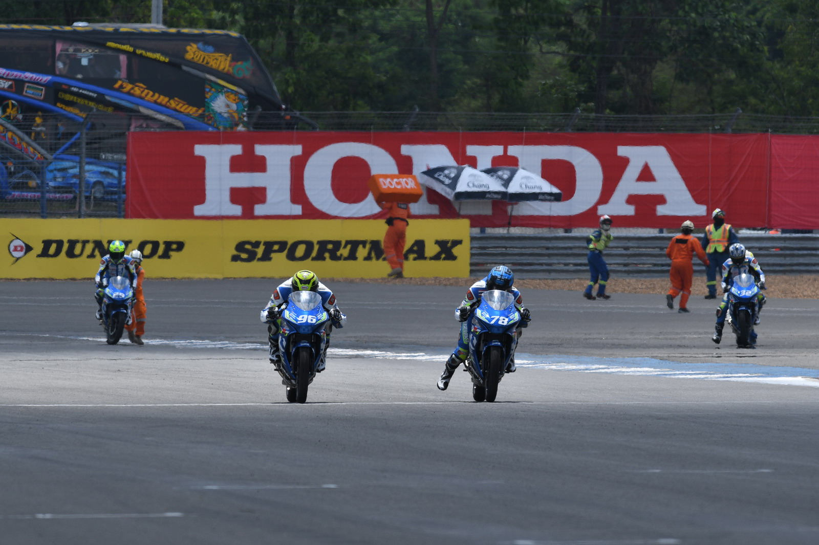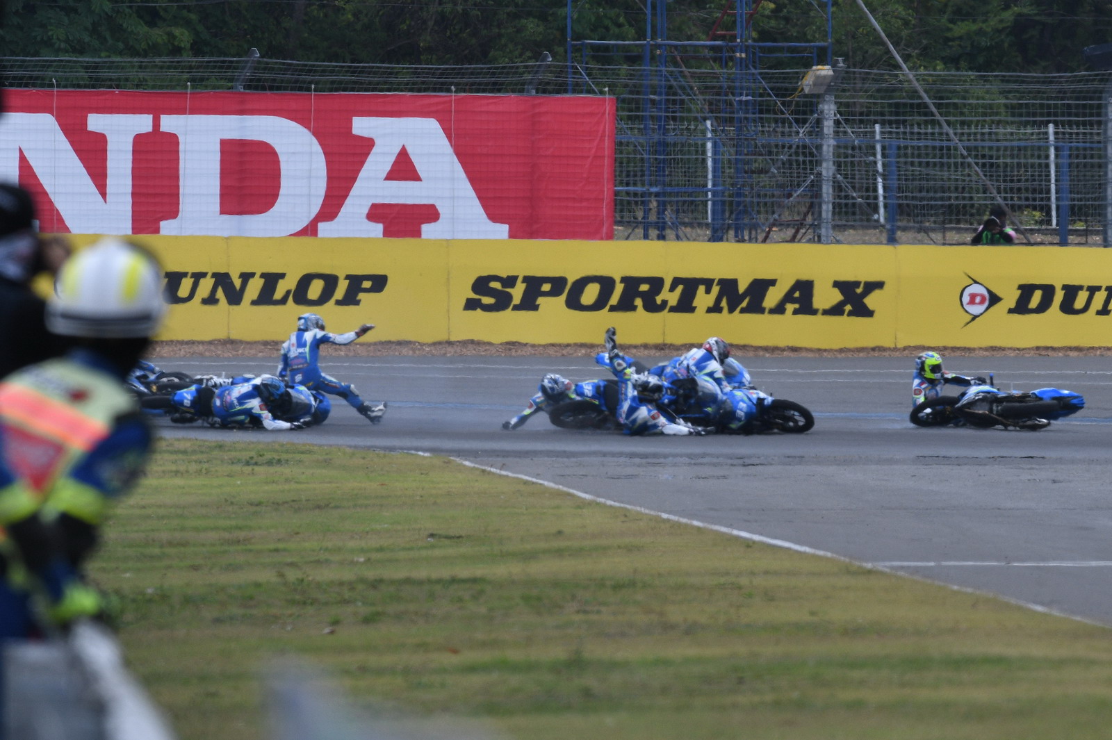 2017' ARRC 第二站泰國,上周六(四月 15 號)舉行的 SAC(Suzuki Asia Challenge,Suzuki 亞洲挑戰(zhàn)賽,統(tǒng)一使用印尼 Suzuki 最新推出的小型跑車 GSX-R 150 作為賽車)第二節(jié)的比賽,最后一圈比賽的最后一個(gè)彎道,因其中兩臺(tái)賽車鎖死后輪首先滑倒,波及了多臺(tái)在前面第一集團(tuán)的賽車,相對較后的賽車未受波及、揀了個(gè)便宜而獲勝。這樣的場景,可見 ARRC 里這些年輕車手的拼勁。