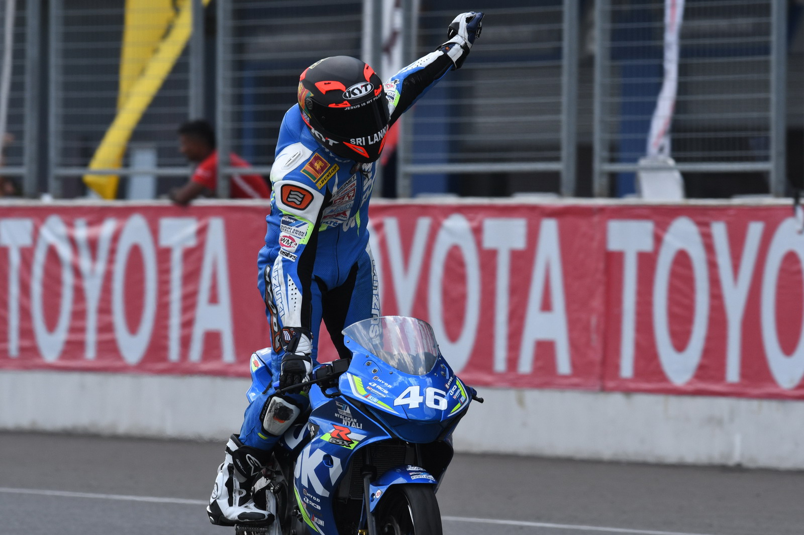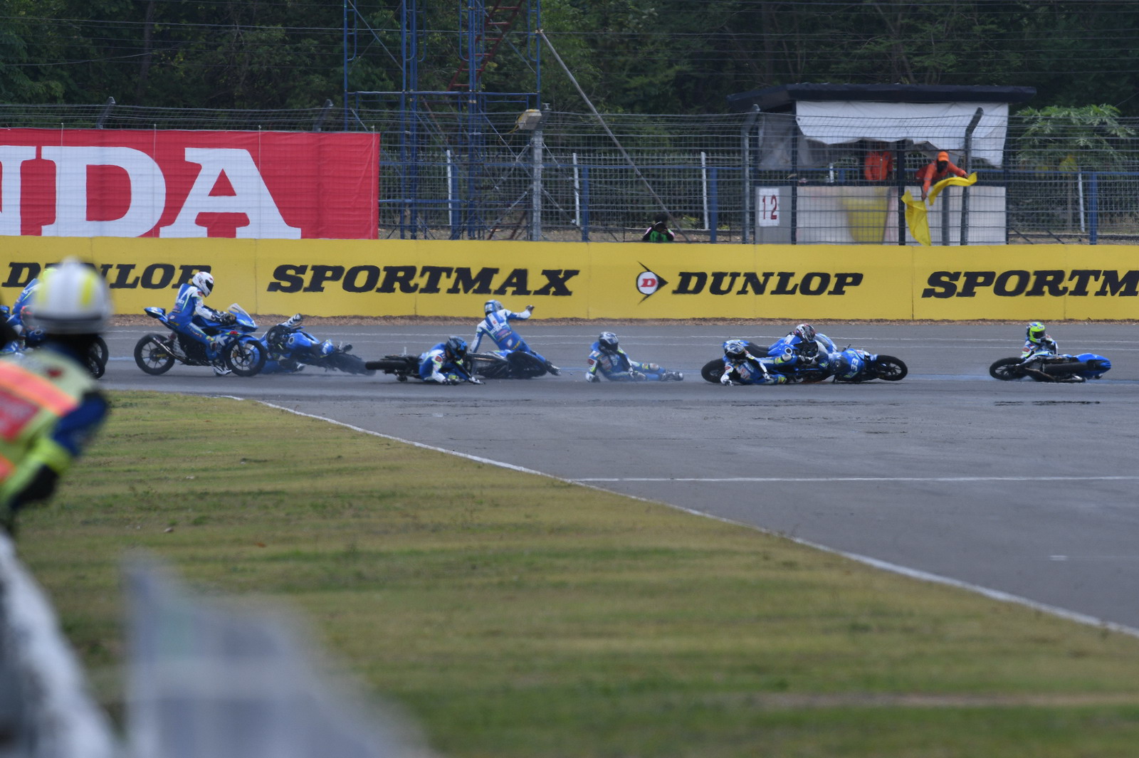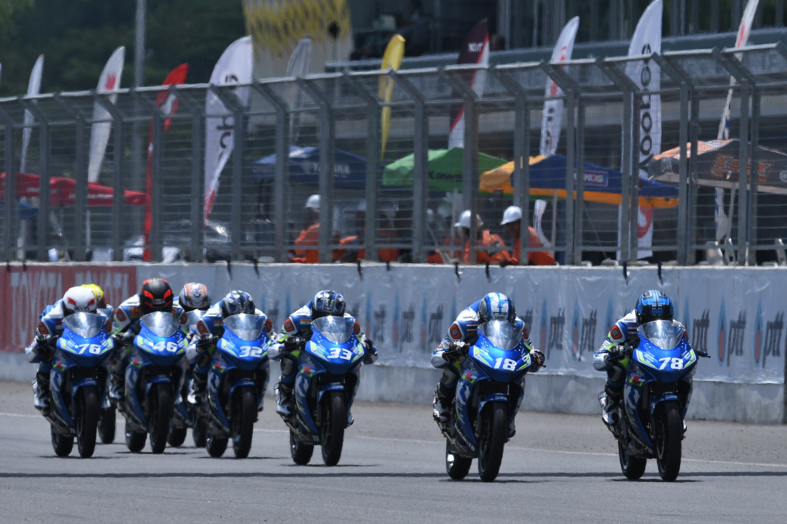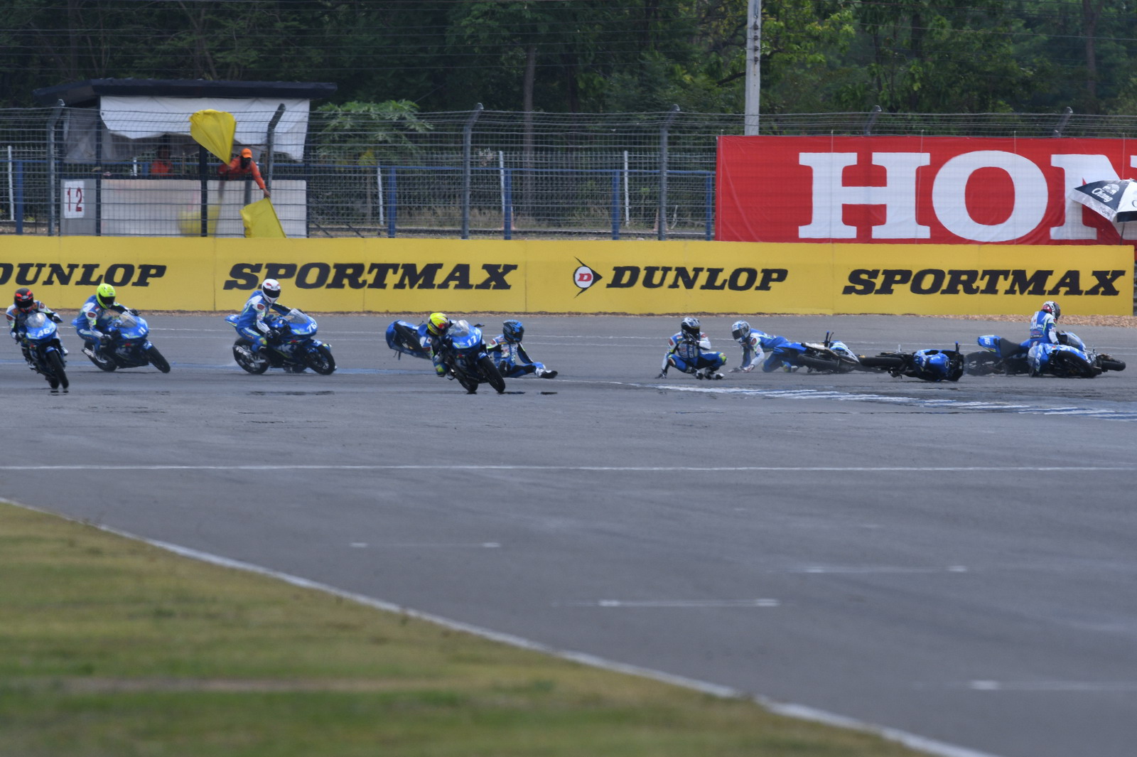 第二站泰國,上周六(四月 15 號)舉行的 SAC(Suzuki Asia Challenge,Suzuki 亞洲挑戰(zhàn)賽,統(tǒng)一使用印尼 Suzuki 最新推出的小型跑車 GSX-R 150 作為賽車)第二節(jié)的比賽,最后一圈比賽的最后一個彎道,因其中兩臺賽車鎖死后輪首先滑倒,波及了多臺在前面第一集團的賽車,相對較后的賽車未受波及、揀了個便宜而獲勝。這樣的場景,可見 ARRC 里這些年輕車手的拼勁。