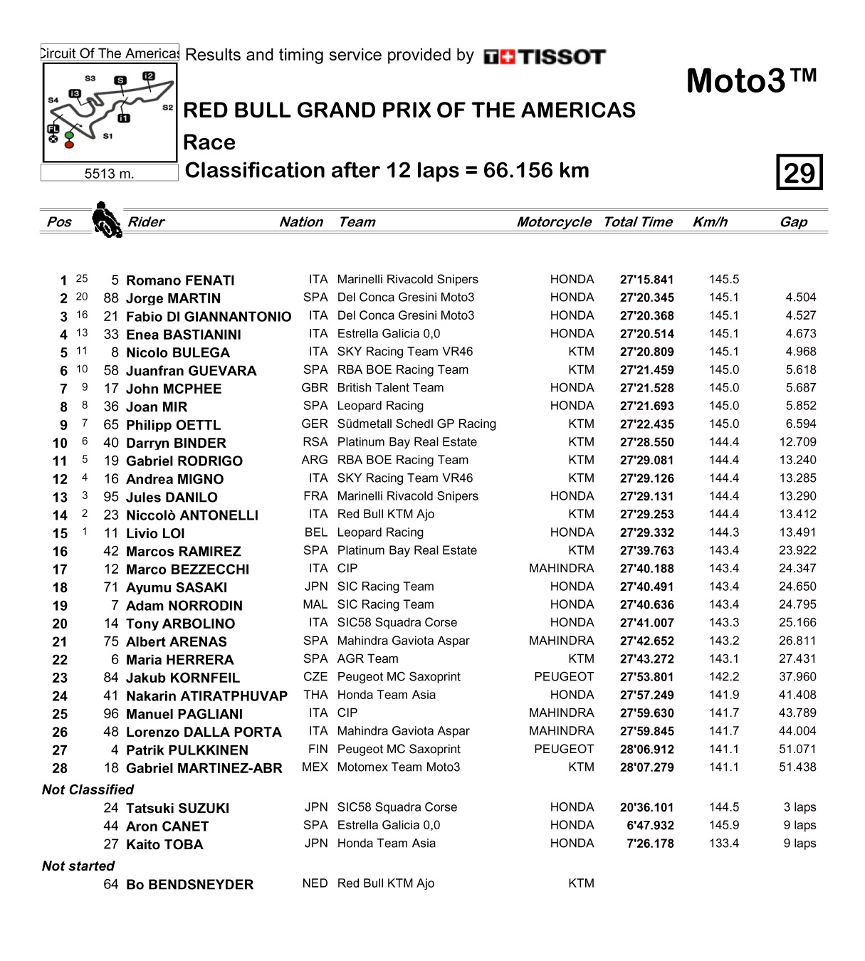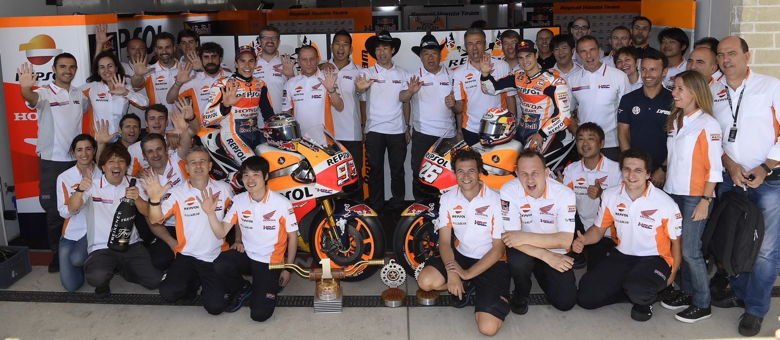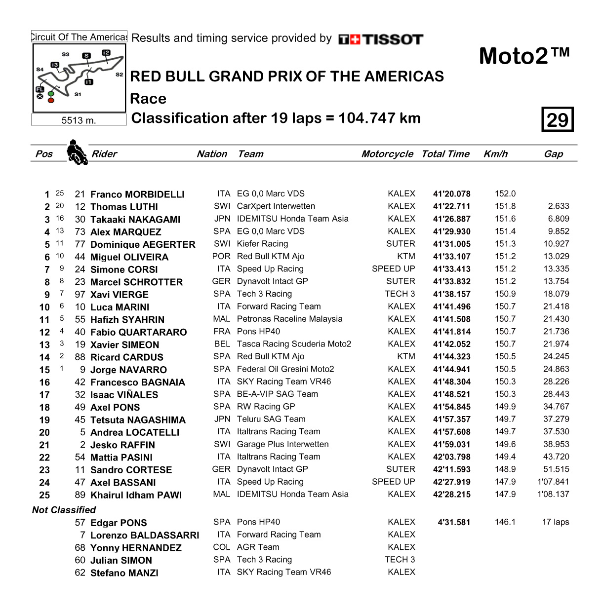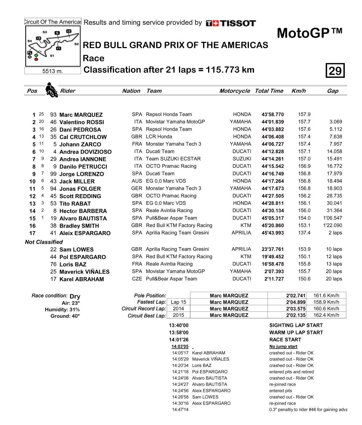 比賽的中段時間,一直跟在隊友后面的馬昆斯進行了超越并開始領(lǐng)跑,隊友彼杜沙的角色似乎馬上就變成了打掩護,讓他在前面無驚無險地順利完成比賽,第五次獲得美國站的冠軍。在賽事的后段,Yamaha 的羅斯超越了彼杜沙,沒經(jīng)過多大的糾纏就拉開了些許的距離,最終以落后頭車的馬昆斯三秒多的時間拿到了第二,彼杜沙拿到了第三。 HRC 車隊在這站的比賽雙雙登上頒獎臺,讓今年的爭奪重現(xiàn)激烈競爭的苗頭。