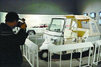 核心提示:參展的比亞喬經(jīng)典三輪摩托。記者 李繼輝攝  電影《羅馬假日》里赫本騎過的黃蜂摩托車,以及210件意大利設計史上的精品,昨日亮