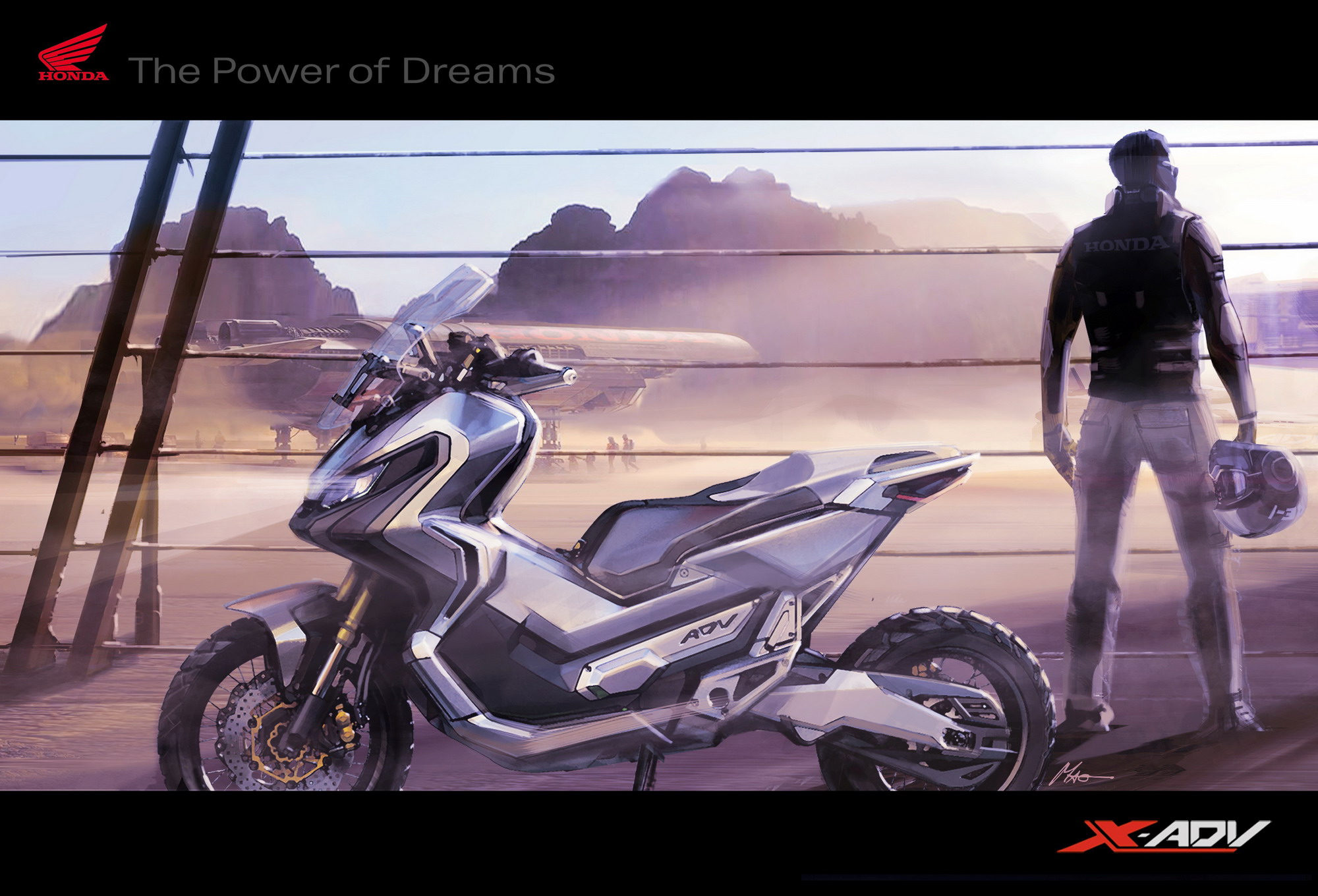 該車由歐洲 Honda 位于意大利羅馬的研發(fā)中心主導(dǎo)下進(jìn)行開發(fā),開發(fā)小組的兩位主要執(zhí)行人 Daniele Lucchesi 和 Maurizio Carbonara,邀請(qǐng)了五位分別來自法國(guó)、英國(guó)、德國(guó)、西班牙和意大利的藝術(shù)工作者,以不同的藝術(shù)表現(xiàn)形式,透過他們的視角,去展現(xiàn) X-Adv 里的 “ 探險(xiǎn)的藝術(shù) ”(Art of Adventure)。