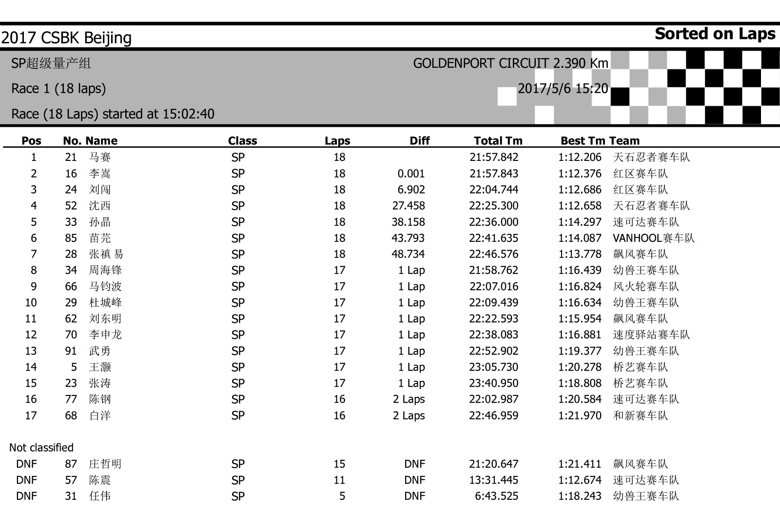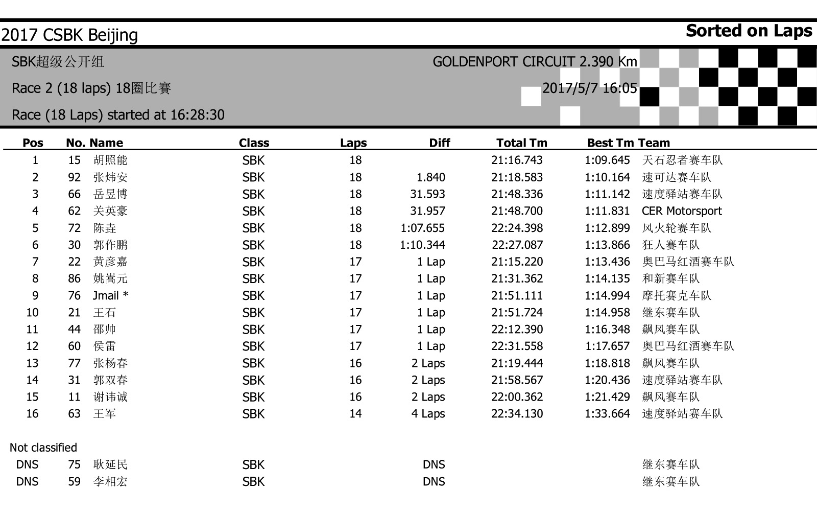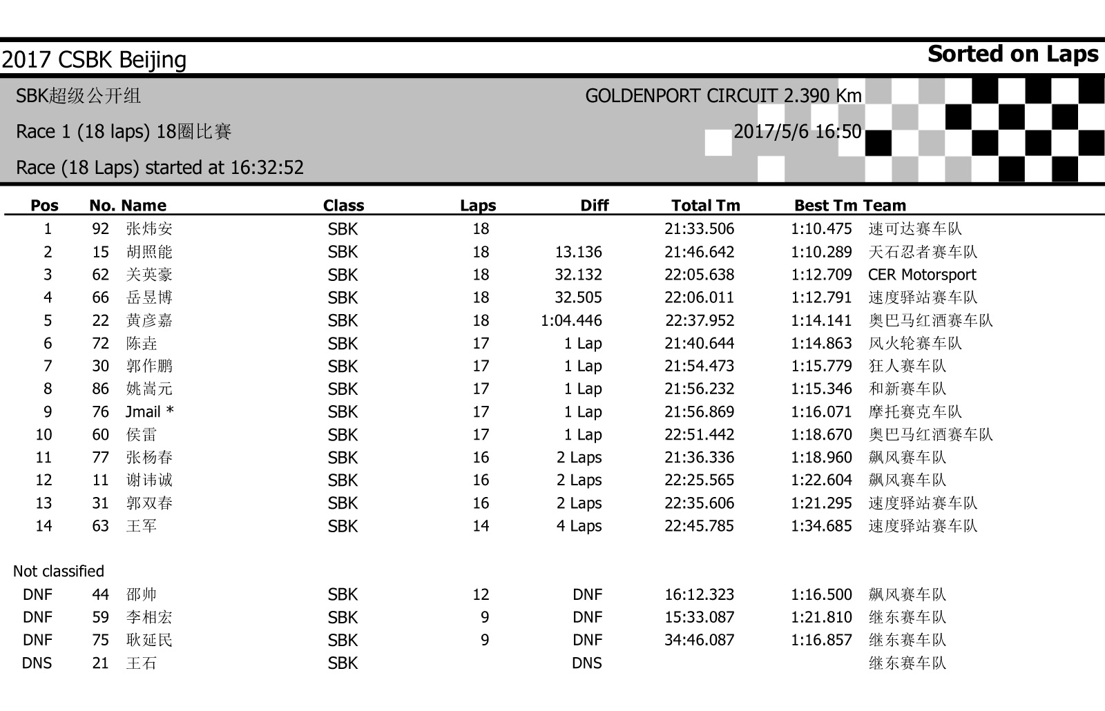 2017中國超級摩托錦標(biāo)賽首站北京站——比賽成績