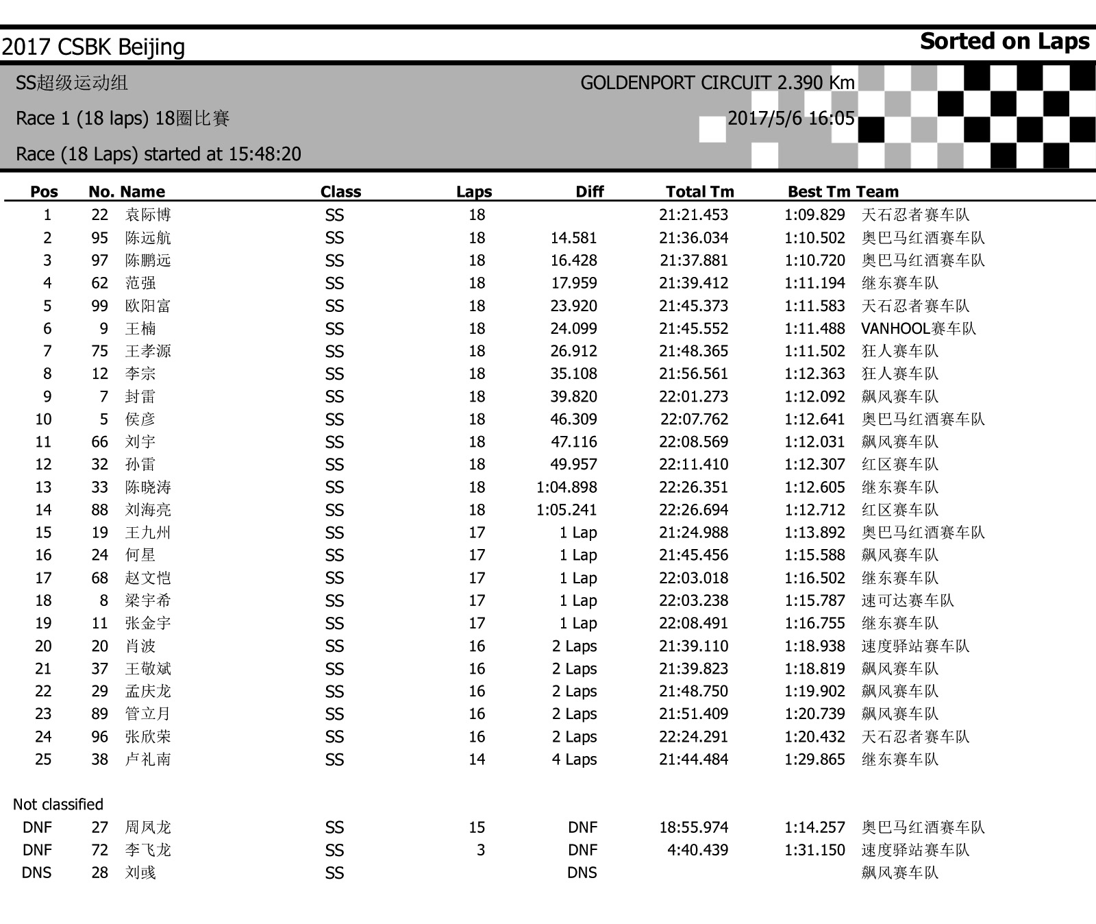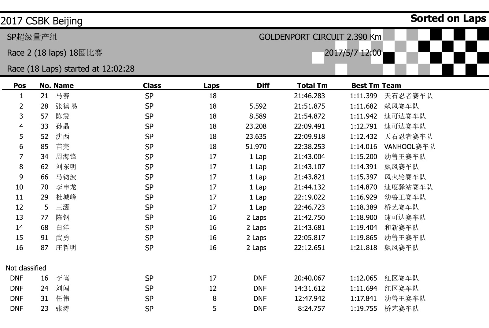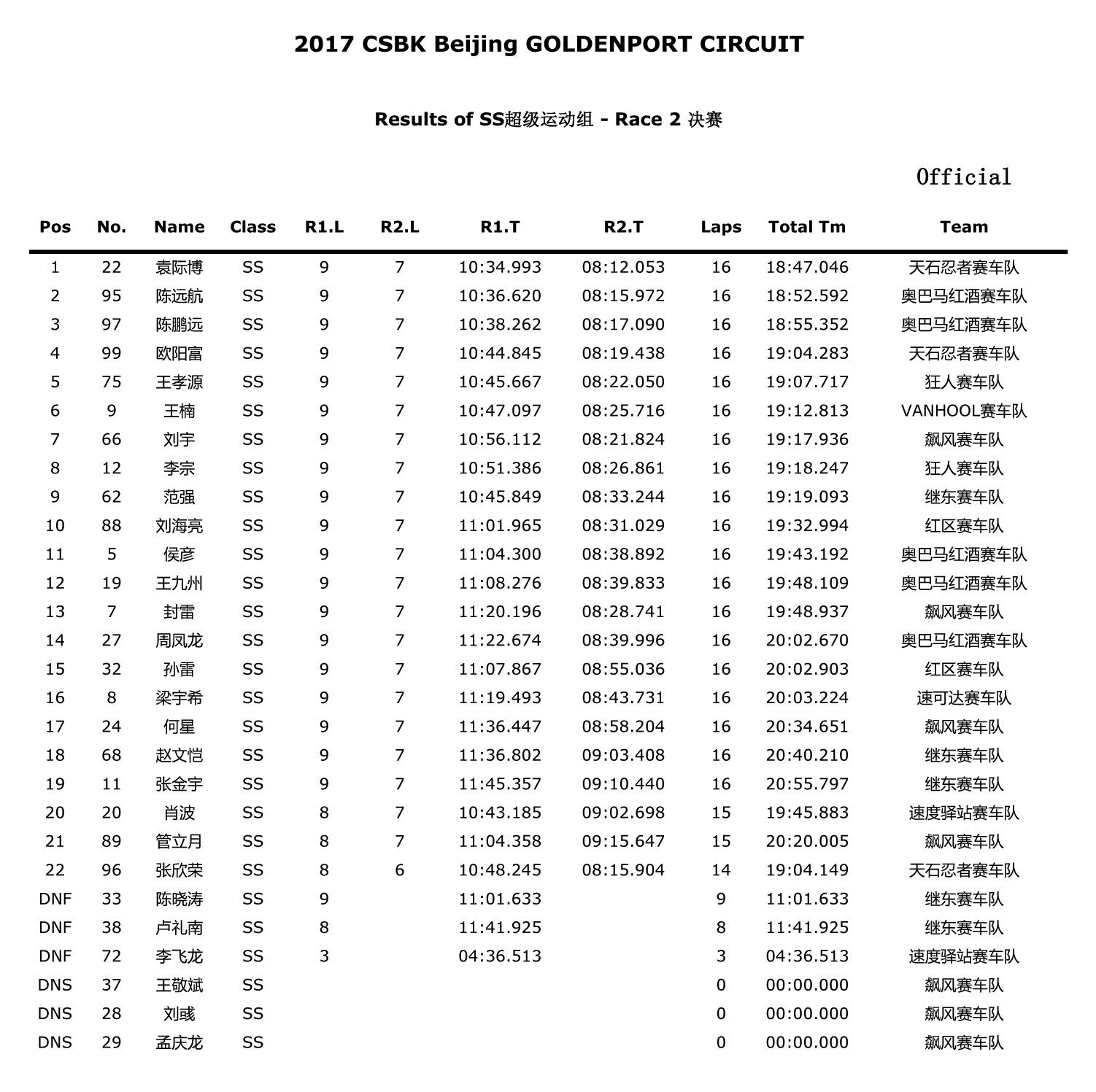 2017中國超級摩托錦標(biāo)賽首站北京站——比賽成績