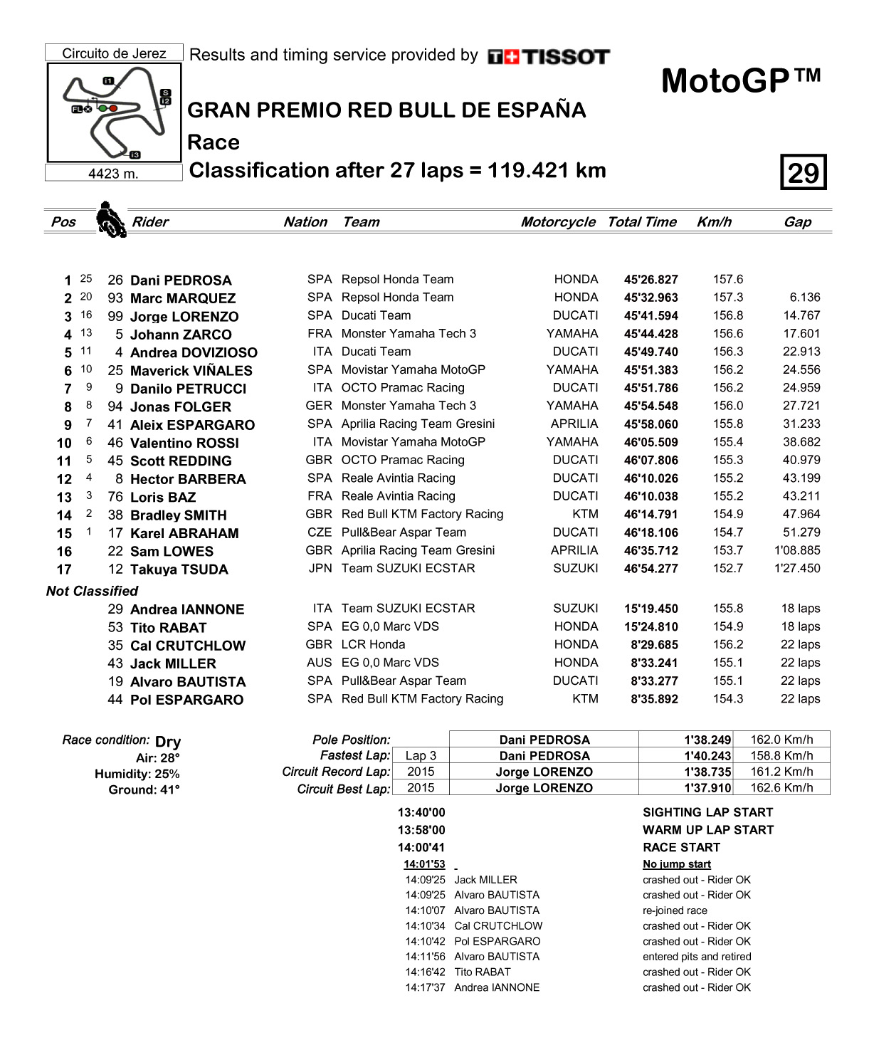 HRC 車隊(duì)的兩位西班牙車手馬昆斯、彼杜沙在之前的排位中表現(xiàn)出色,正式比賽中分別排在了前兩名起步。另一支 Honda 車隊(duì)的英國車手 C.Crutchlow 排在了第三,Honda 的賽車占據(jù)了起跑點(diǎn)上的第一排。而目前在車手積分榜上領(lǐng)先的 Yamaha 車隊(duì)兩位車手,羅斯排到了第三排(第七),維尼艾利則排在了第二排(第四)。