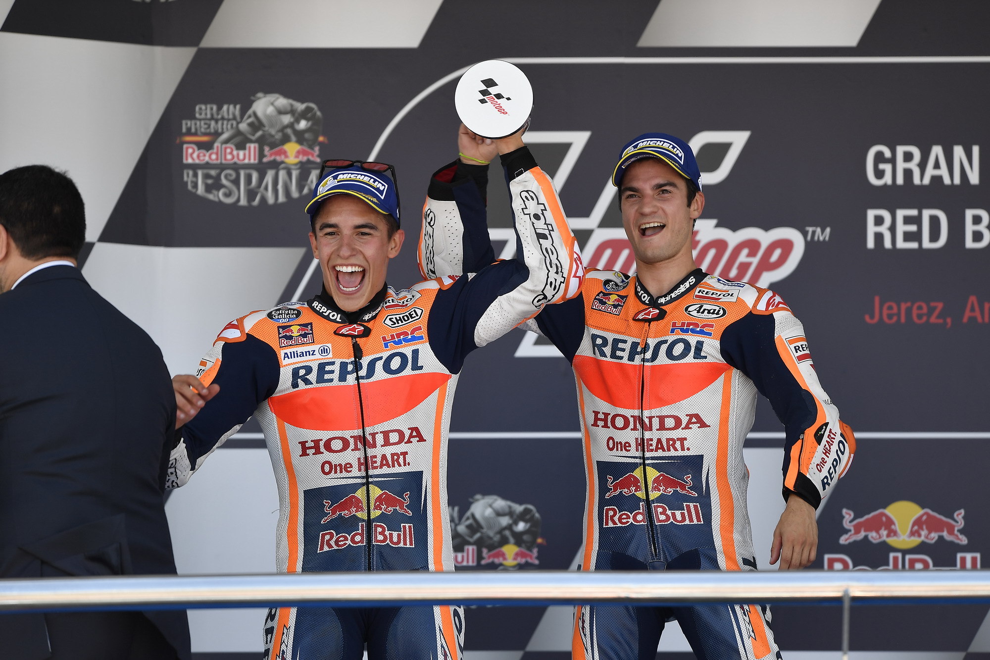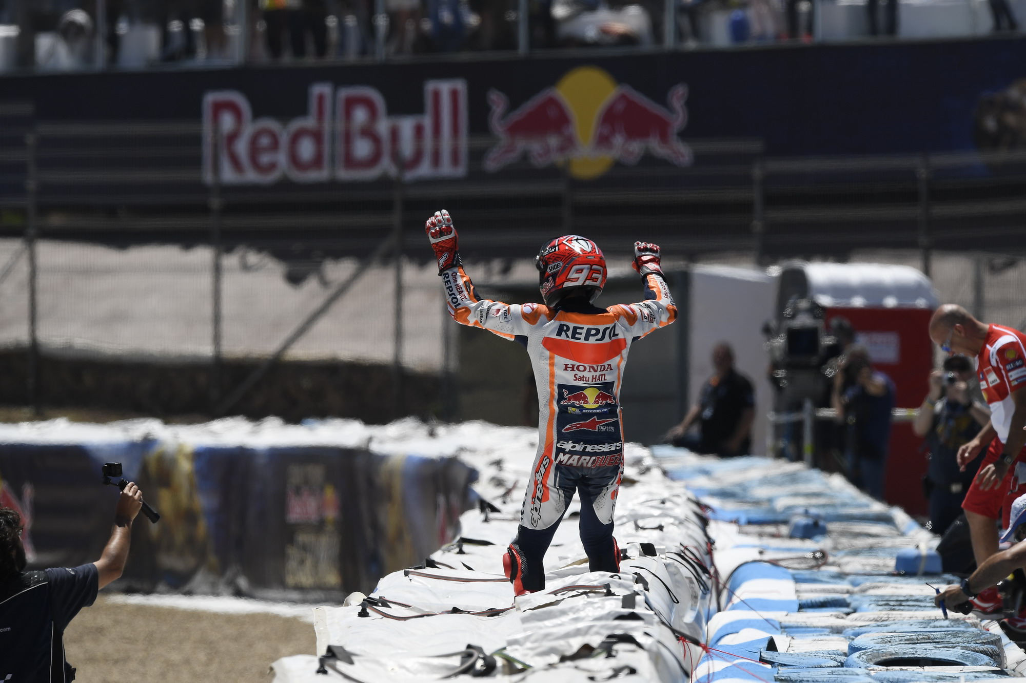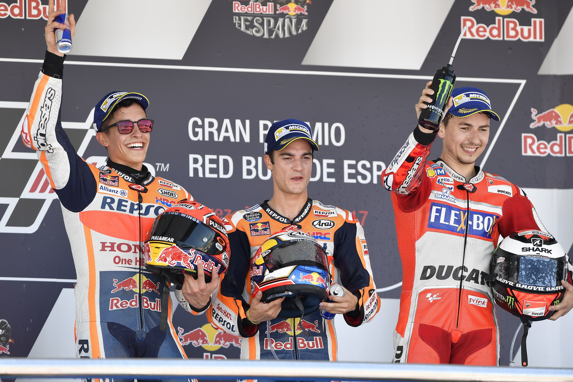 正式比賽一開始,HRC 車隊(duì)的兩位車手就雙雙帶出,彼杜沙率先領(lǐng)跑并展現(xiàn)出一副斗志昂揚(yáng)的姿態(tài)。除了在比賽的初段,前列的車手之間還有一些糾纏之外,半程之后就幾乎不再有懸念,彼杜沙在前面是越跑越精神振奮的模樣、不斷地刷新著最快圈速,在第二的馬昆斯在擺脫了 Zarco 之后也逐漸拉開了距離,一點(diǎn)一點(diǎn)向著隊(duì)友靠攏。最終,主宰了這場比賽的彼杜沙順利地獲得了本站比賽的冠軍,距離他的上一個(gè)分站冠軍(2016 年九月舉行的圣馬利諾站)已經(jīng)隔了七個(gè)分站。隨后的馬昆斯獲得了本站的第二,今年剛轉(zhuǎn)到杜卡迪的羅倫索拿到了第三,為他自己和杜卡迪拿到了今年開賽以來的最好成績。