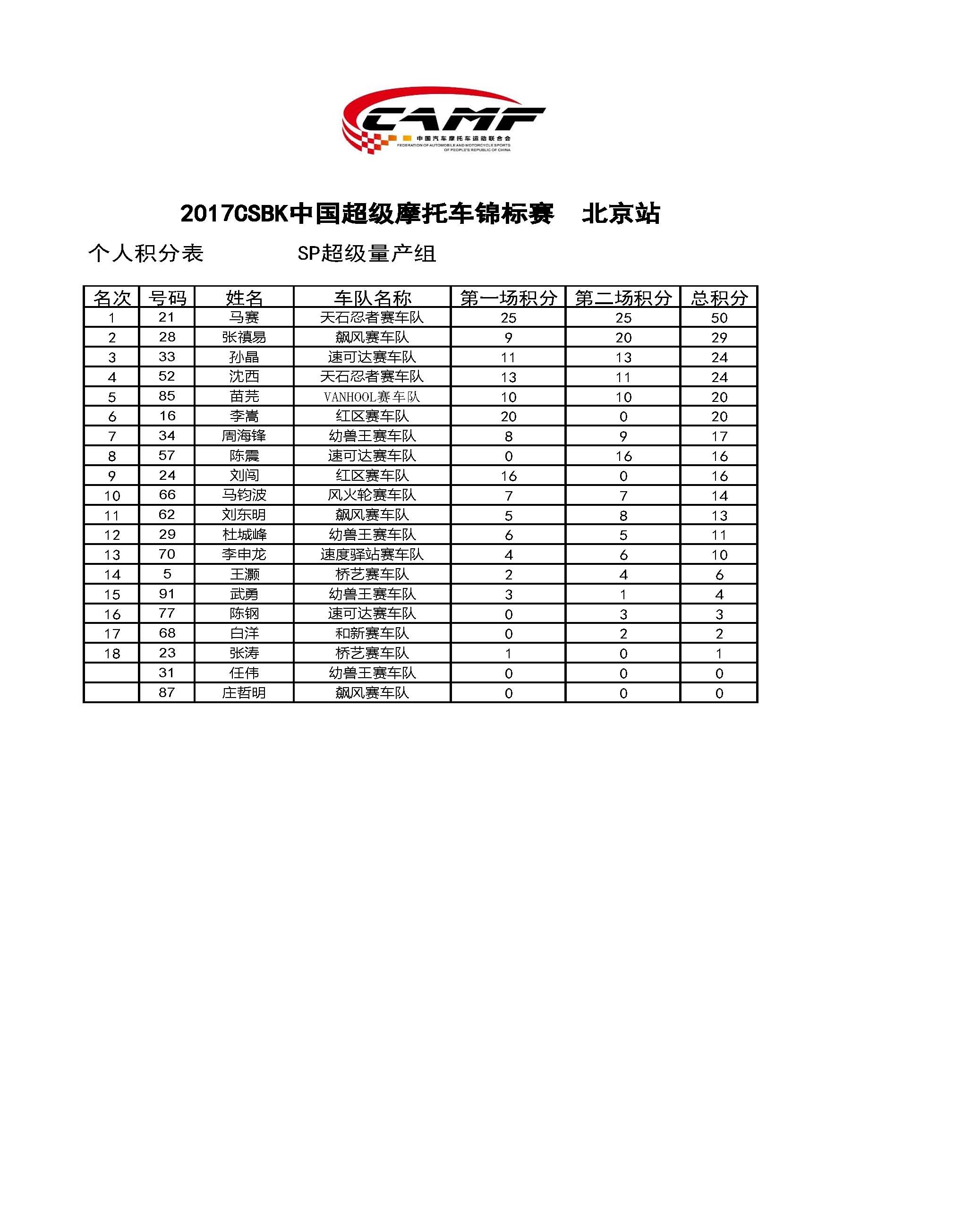 2017北京站SP超級(jí)量產(chǎn)組個(gè)人積分表