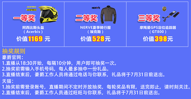 豪爵官網(wǎng)、天貓直播間將于18:30-21:30開(kāi)展輪番抽獎(jiǎng):