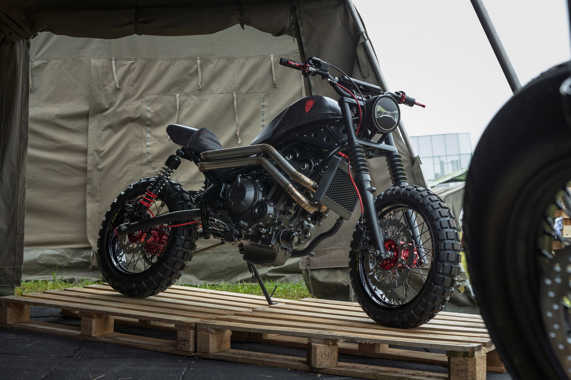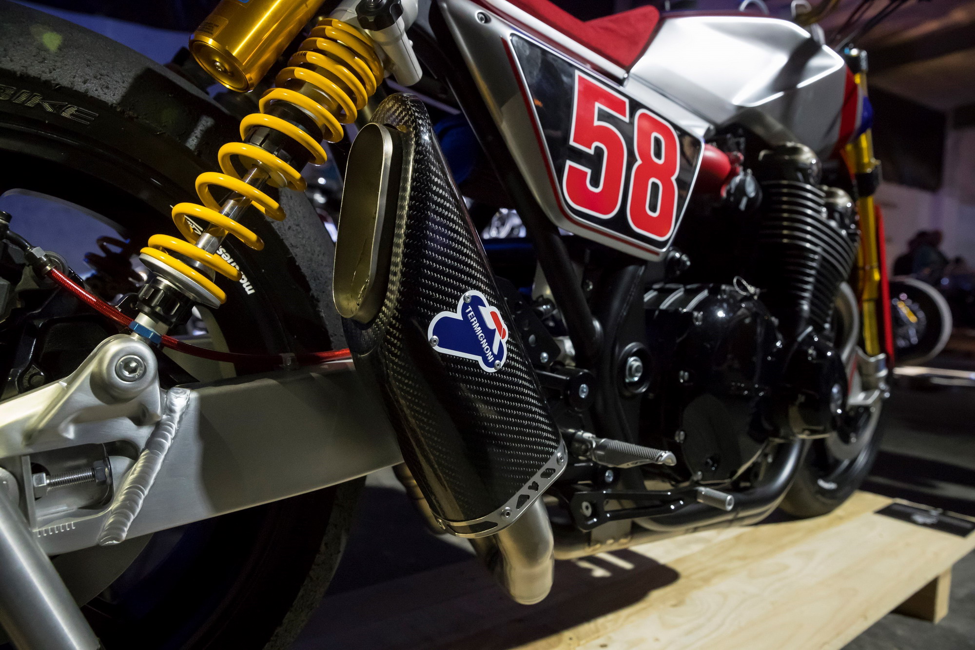 Honda 派出了強大的陣容參加今年的這個海邊活動。展品之中,包括了以 雙缸機器 CX500 為基礎(chǔ)改裝而來,采用了紅、白、藍(lán)色 HRC 配色方案的美國已故車手海登(Nicky Hayden)紀(jì)念定制車。以及早前就已經(jīng)發(fā)布了的,貼有意大利車手施蒙切尼 58 號圖案的 CB1100TR 概念車。