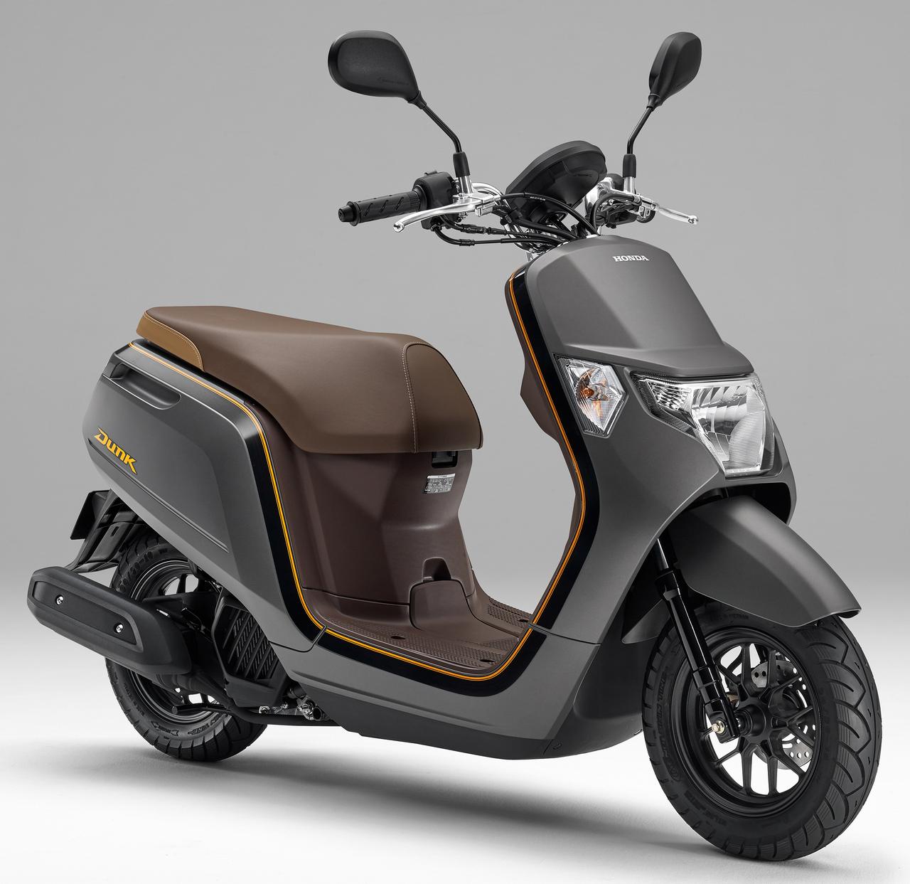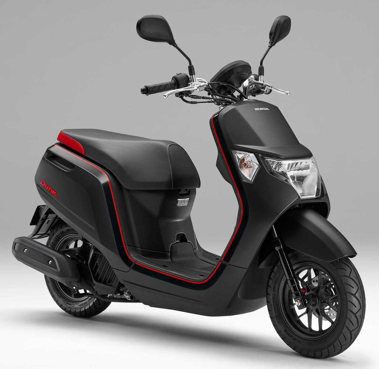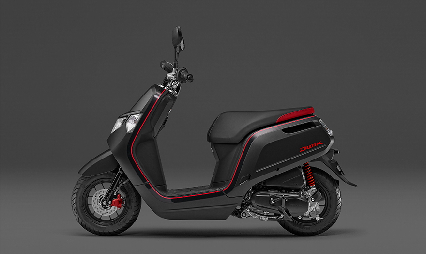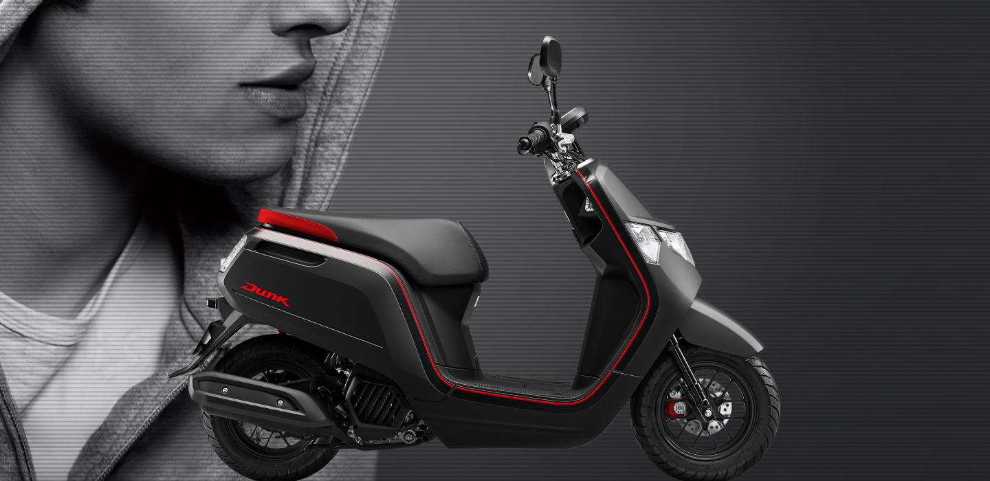 Dunk 有著一個充滿個性化的外觀造型,搭載一副水冷四沖程單汽缸、SOHC 兩汽閥、帶 eSP(enhanced、Smart、Power,意為強化價值、高精靈敏度、動力)標(biāo)識的發(fā)動機,排汽量 49 cc,配備了 PGM-FI 電子燃油噴注系統(tǒng)、無段變速,最大動力輸出 3.3 kw(4.5 匹)。車身方面,采用前后10英寸直徑的車輪,LED 后尾燈,全車重量為81公斤。