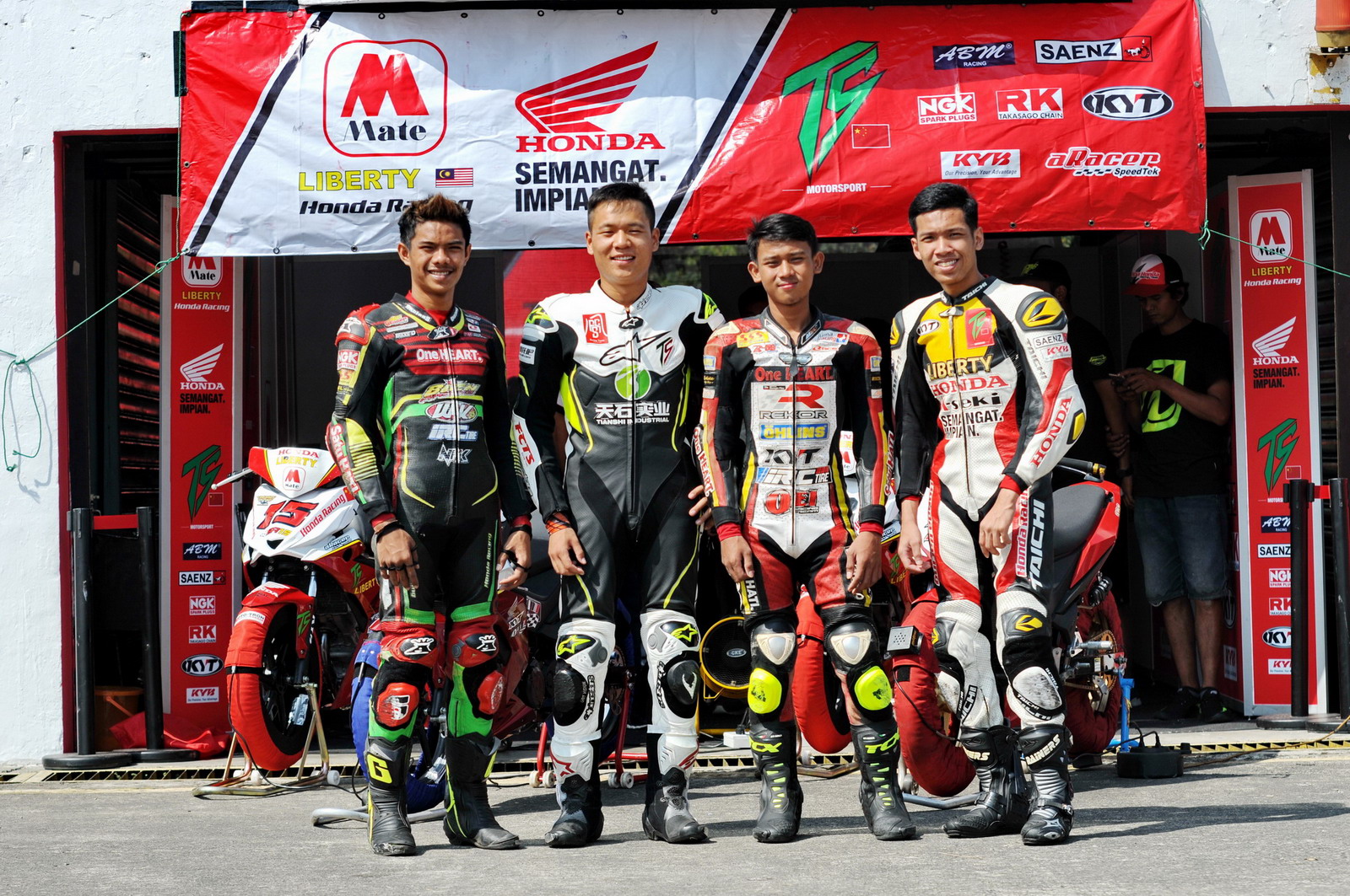 今年首次參加此級(jí)別比賽的袁際博,早前就坦誠、參加這個(gè)級(jí)別面對(duì)著極大的挑戰(zhàn),東南亞車手在彎樑級(jí)別有著近乎是 “ 先天 ” 的優(yōu)勢,長年激烈比賽的磨練、也是國內(nèi)現(xiàn)有的環(huán)境所無法比擬。同時(shí)除了駕駛習(xí)慣之外,相對(duì)排量較低的彎樑車,對(duì)于袁際博這山東漢子來說,又是另外的一翻挑戰(zhàn)。下面的這張合照,大家可以看看袁際博(左二)與東南亞車手在體型上的差異。