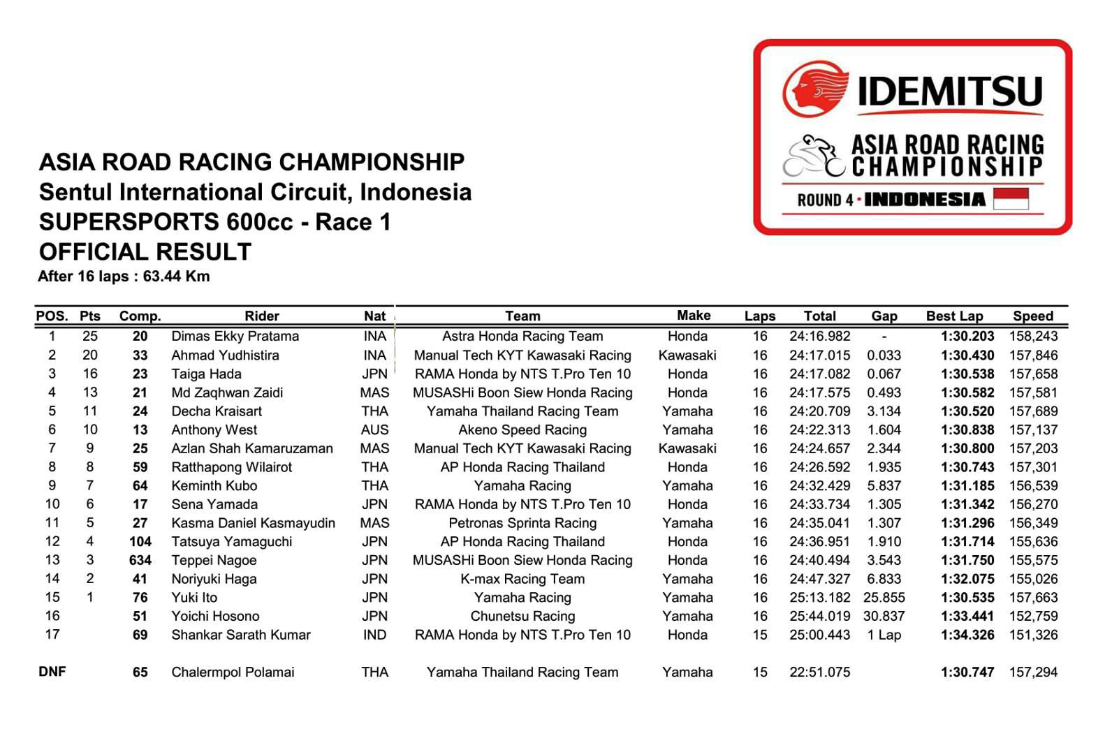 在過(guò)去幾站表現(xiàn)并不算特別突出的印尼車手似乎一下子復(fù)活,起步不久后就帶出。賽事中段過(guò)后,現(xiàn)場(chǎng)呈三部 Honda 與一部 Kawasaki 的攻防戰(zhàn)之勢(shì),賽事的末段還一度出現(xiàn)了一個(gè)拼搶的小高峰。最終印尼 Honda 車隊(duì)的 Dimas Ekky Pratama 搶回了位置、奪得了冠軍,另一名印尼車手 Ahmad Yudhistira(Kawasaki)拿到了第二,日本車手羽田太河(Taiga Hada)獲得了第三,前三名沖線的車手、時(shí)間相差僅僅是 0.067 秒。