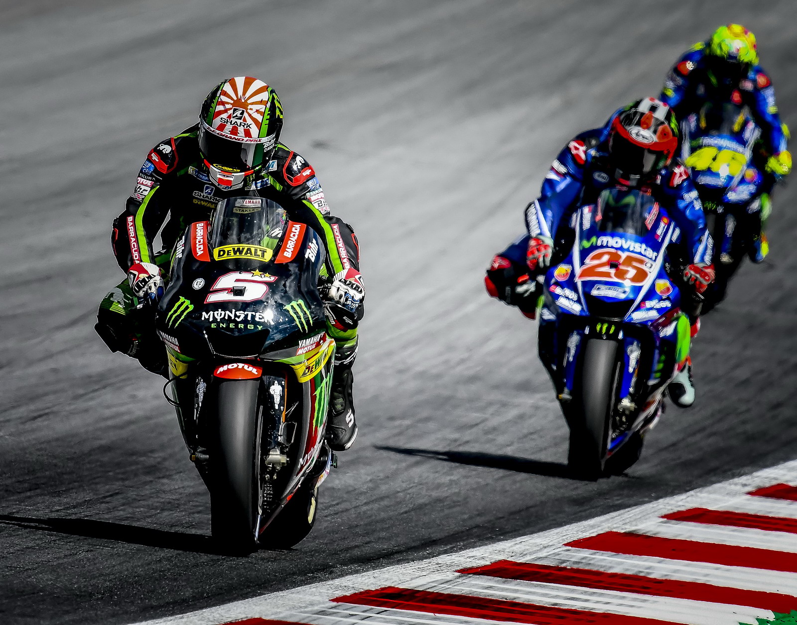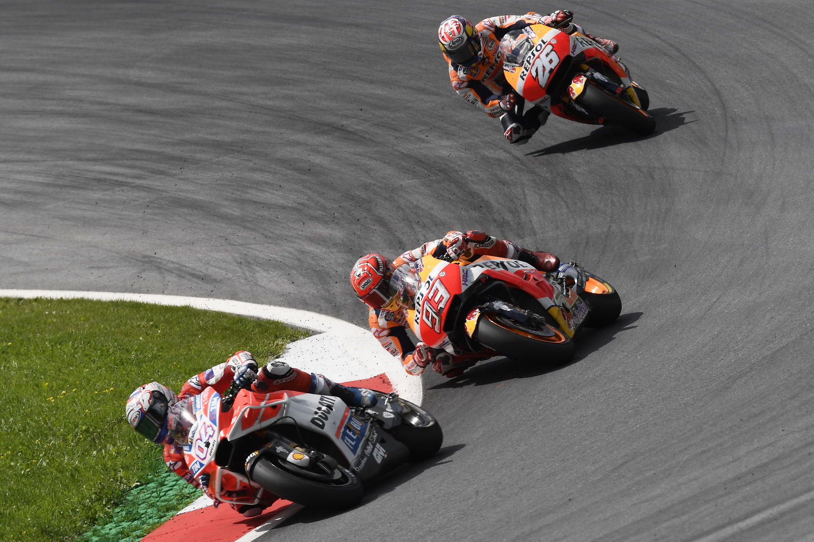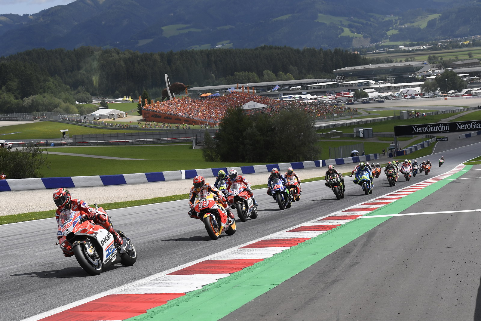 MotoGP 級別的賽程是 28 圈。比賽的初段,是杜卡迪、Honda、Yamaha 三支工廠車隊(duì)加一個(gè) Tech 3 車隊(duì)的 Zarco 在前,羅倫索領(lǐng)跑。到比賽的中段,馬昆斯開始發(fā)動(dòng)攻防大戰(zhàn)、并取得了領(lǐng)先的位置,但無法甩掉后面的對手。到了最后的七、八圈,前面就剩下了馬昆斯與杜維斯奧索的爭奪,兩人互相拉鋸、各有領(lǐng)先,激烈的場面堪稱經(jīng)典。兩人激戰(zhàn)至最后一圈的最后一個(gè)彎道,最終杜維斯奧索以 0.176 秒之差,奪得了奧地利站的冠軍,這是他在今年為杜卡迪奪得的第三個(gè)分站冠軍,這一站的勝利也讓他上升到積分榜的第二。馬昆斯拿下了本站的第二,積分榜上繼續(xù)處于領(lǐng)先。無人 “ 看管 ” 的彼杜沙則拿到了本站的第三。