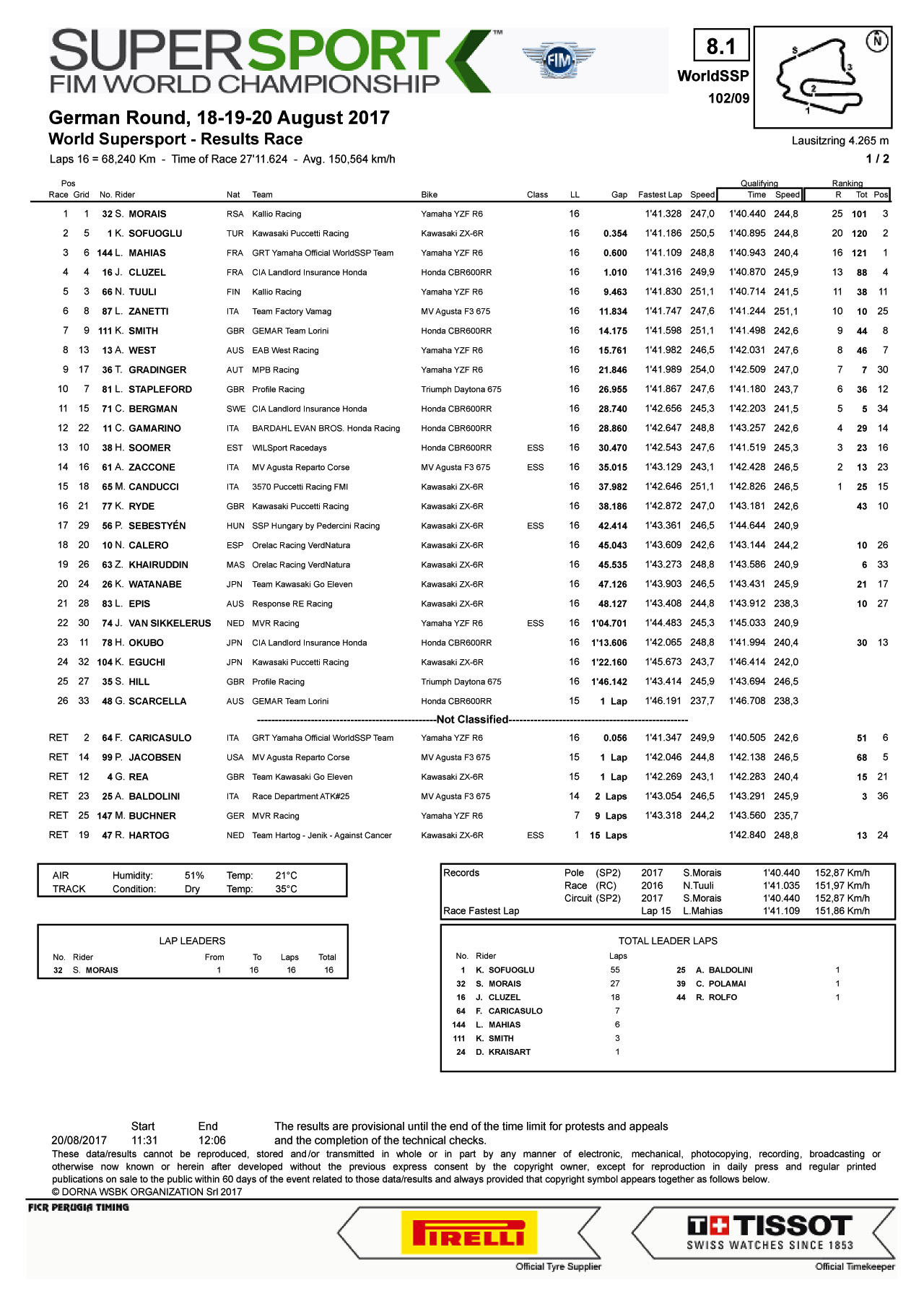比賽最終以結(jié)束前的第 16 圈時(shí)的位置作為最后的成績,32 號車、來自南非的 Morais 奪得了個(gè)人職業(yè)生涯中的首個(gè) WSS 600 分站冠軍。1 號車的土耳其車手、去年的世界冠軍 Sofuoglu 獲得了第二,144 號車的法國車手 Mahias 獲得了第三。