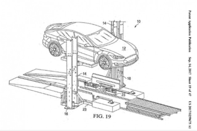特斯拉在5月份提交了這項(xiàng)專利,專利顯示只需用一臺(tái)特制升降機(jī)將車輛舉起,然后將電池組從底盤拖出更換,整個(gè)過(guò)程只需要技術(shù)人員監(jiān)督即可。