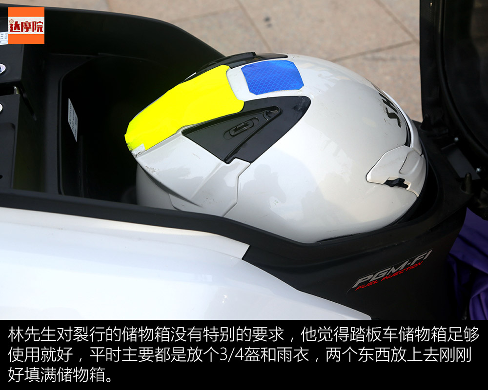 林先生對裂行的儲物箱沒有特別的要求,他覺得踏板車儲物箱足夠使用就好,平時主要都是放個3/4盔和雨衣,兩個東西放上去剛剛好填滿儲物箱。